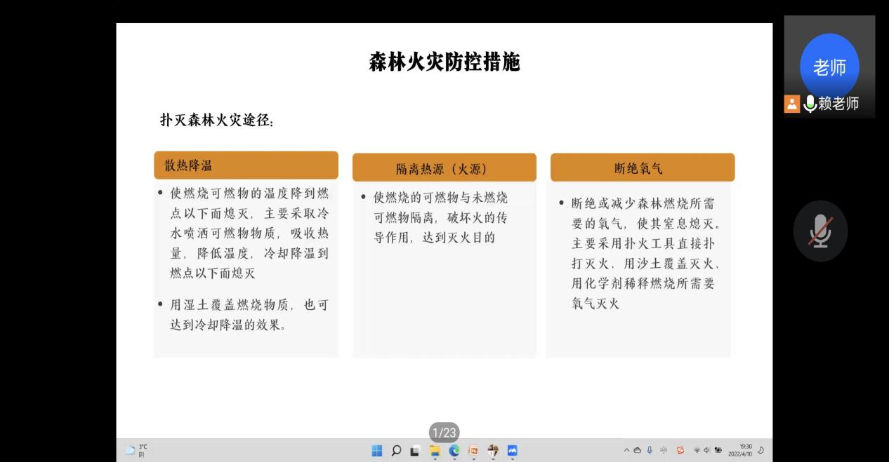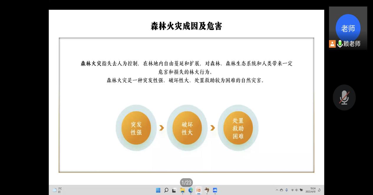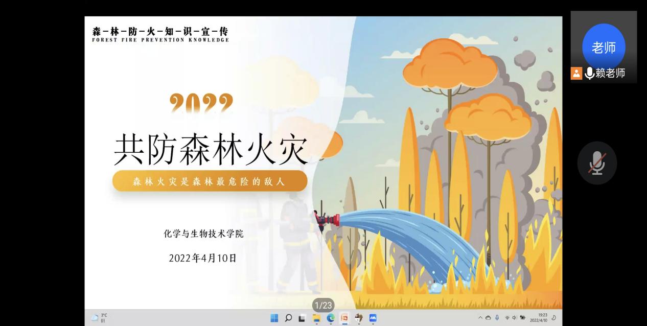 为了加强大学生的防火意识,提高大学生对森林火灾的认识和防控措施,减少森林火灾的发生,化学与生物技术学院于2022年4月10日在线上开展“共防森林火灾,共守绿色家园”主题班会。