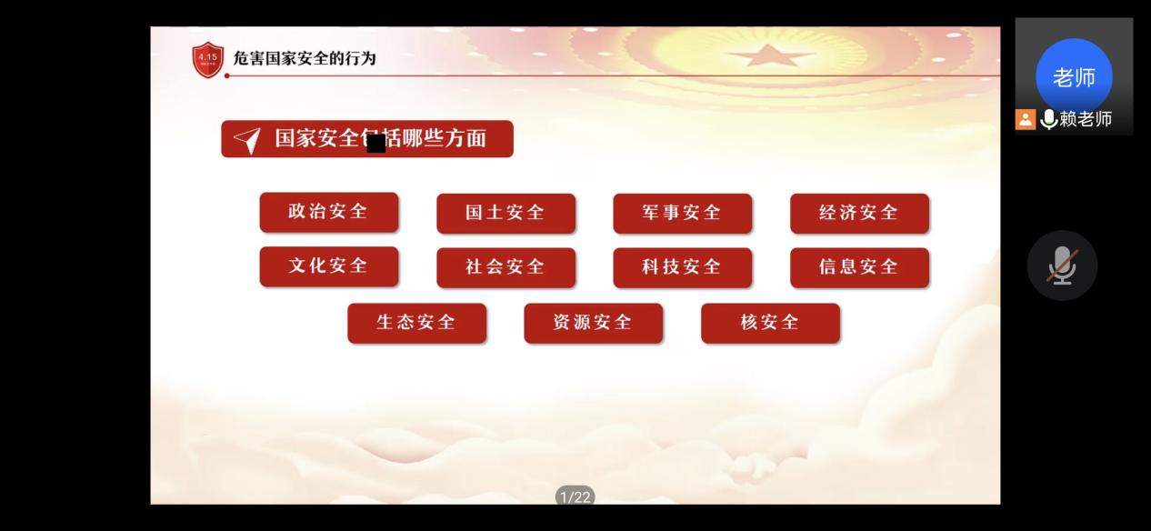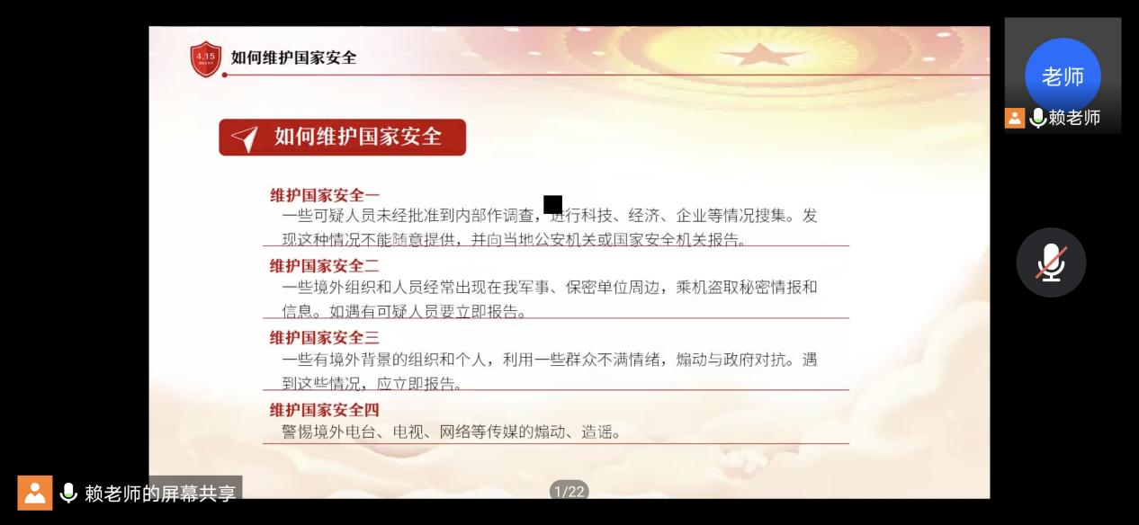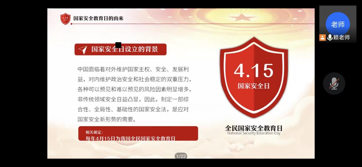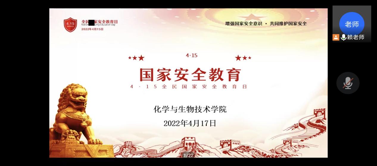 为进一步加强平安校园建设,普及国家安全知识,增强国家安全意识,确保师生健康和生命安全,化学与生物技术学院于2022年4月17日线上开展了“4·15国家安全教育日”主题班会。
