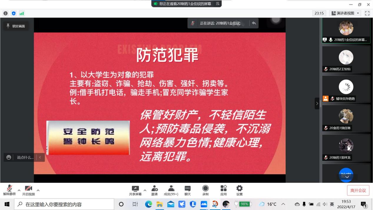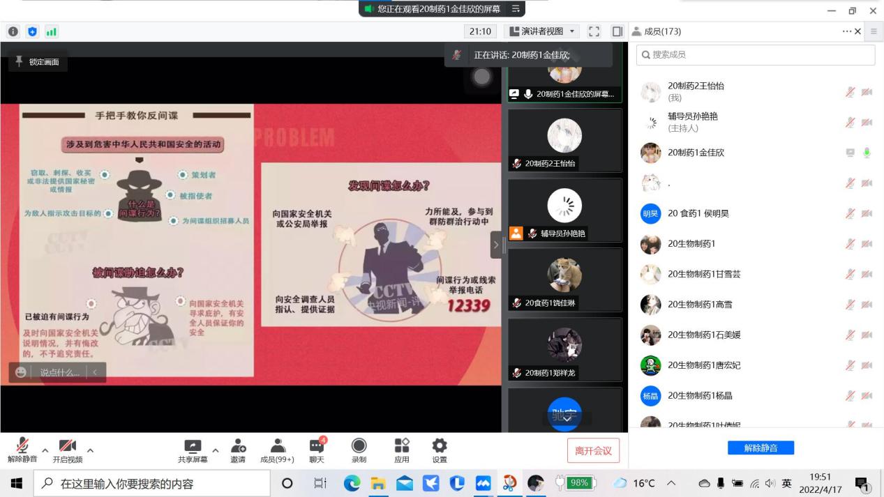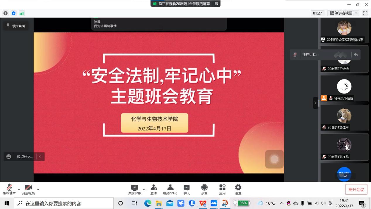 为适应我国国家安全面临的新形势、新任务,进一步规范和加强同学们的法制观念,提高在座的学生们在日常生活中的安全意识,化学与生物技术学院20级部分同学于2022年4月17日19:30在线上举办了一场以“安全法制,牢记心中”为主题的特色班会。本次班会由辅导员孙老师组织发起,金同学演讲,化学与生物技术学院20级制药、食药共四个班级参与。