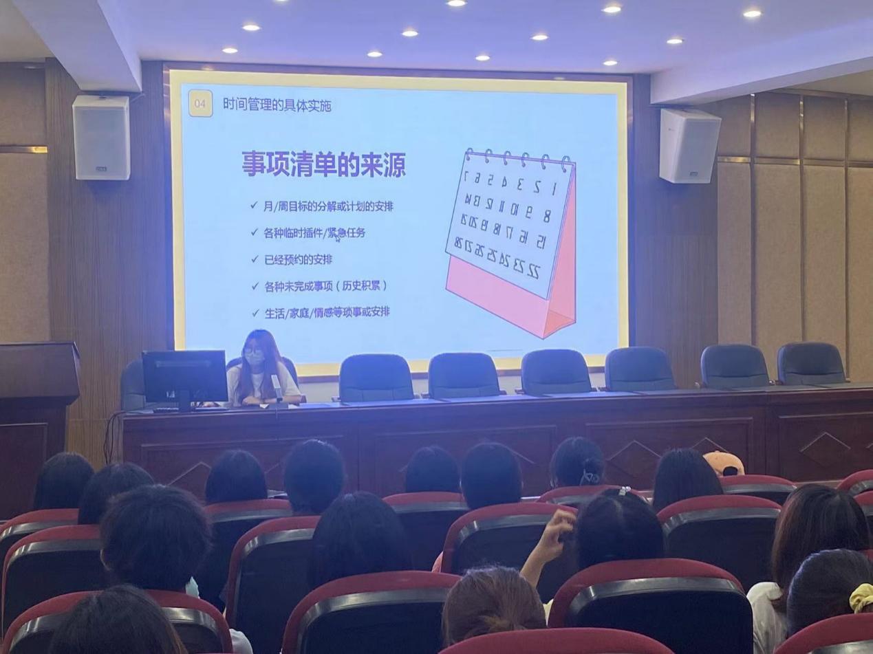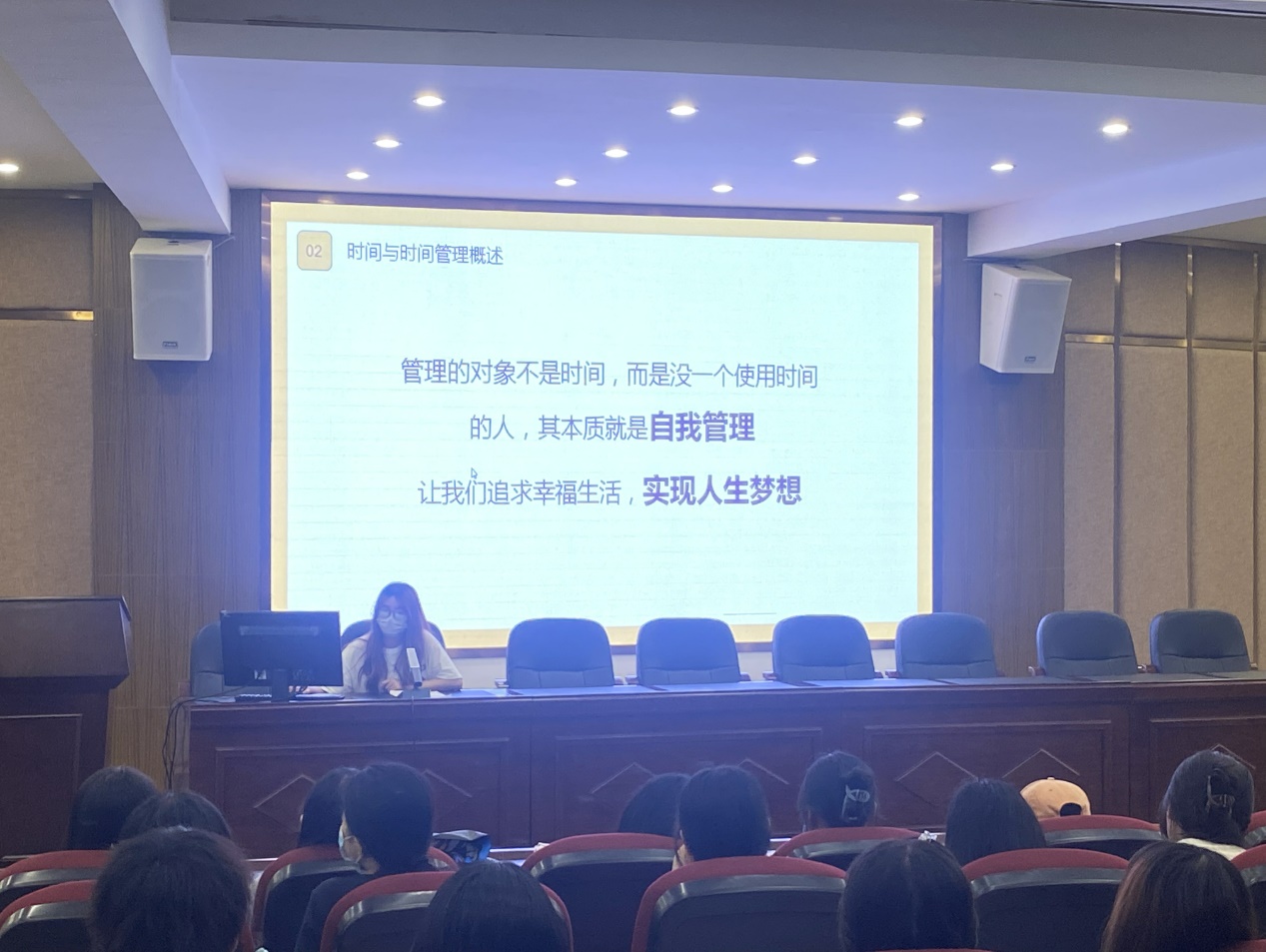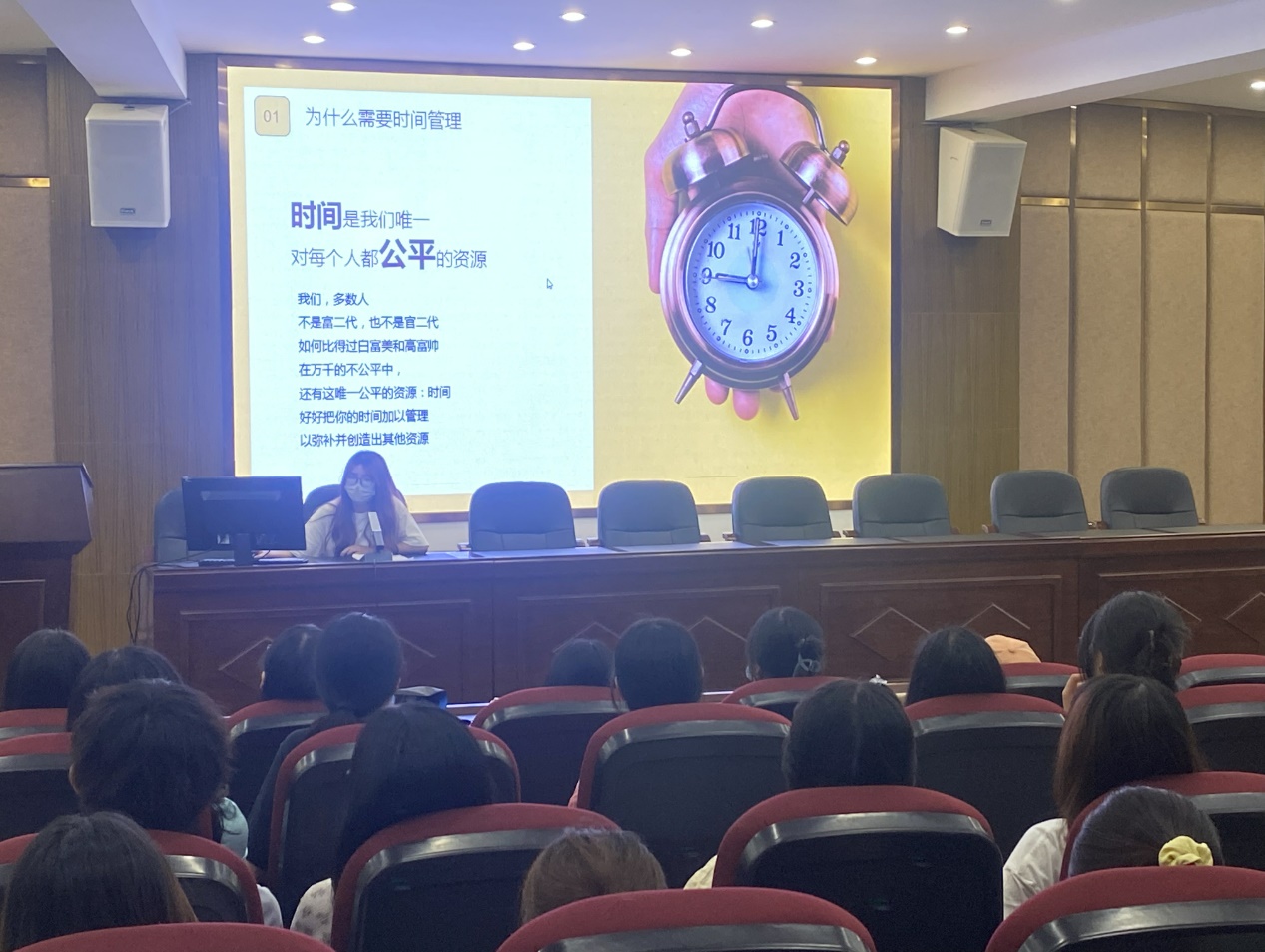 王同学首先向同学们明确指出时间是我们唯一对每个人都公平的资源,需要做好时间管理,不再因虚度光阴而悔恨。其次,她讲述了时间无法开源、无法蓄积、不可取代、不可再生的特征,形象描述了时间容易被白白浪费,要学会珍惜时间,追求幸福生活,实现人生梦想。接着,她简述了时间管理的基本原理,把握住效能、效率、勤恳三要素方能有效益。最后,她分享了事项清单管理的重要方法,呼吁同学们要努力成为能珍惜时间、会管理时间、为了目标全力以赴的人。