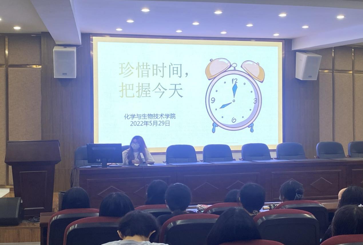 为了让同学们明白时间在生活中的重要性,增强时间观念,有效利用时间,帮助同学们学会时间管理,合理规划人生,化学与生物技术学院于2022年5月29日在多功能厅开展了“珍惜时间,把握今天”主题班会。