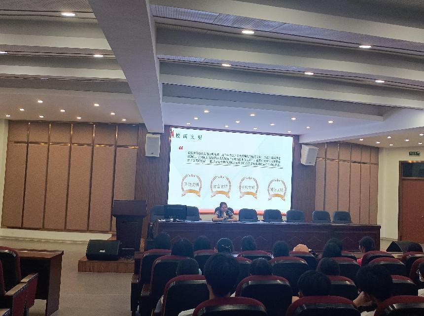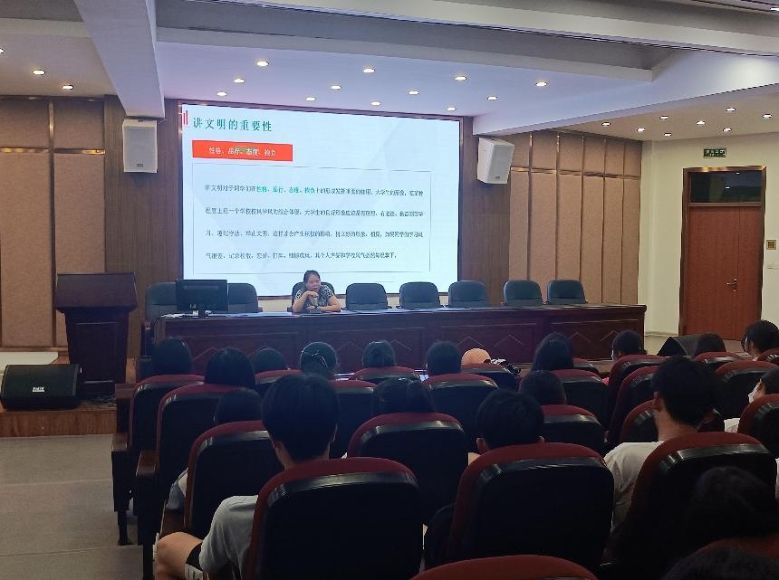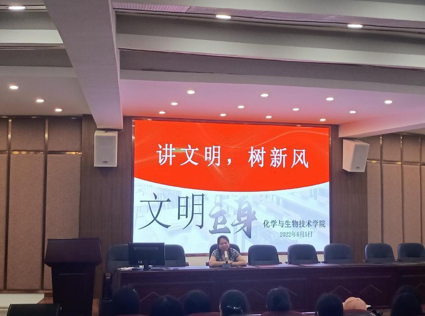 文明礼仪是我们学习、生活的根基,是我们健康成长的臂膀。为帮助同学们养成良好的文明行为习惯,营造良好的舍风、班风和学风,讲文明语言,做文明学生,化学与生物技术学院于2022年6月5日在多功能厅开展了“讲文明,树新风”主题班会。