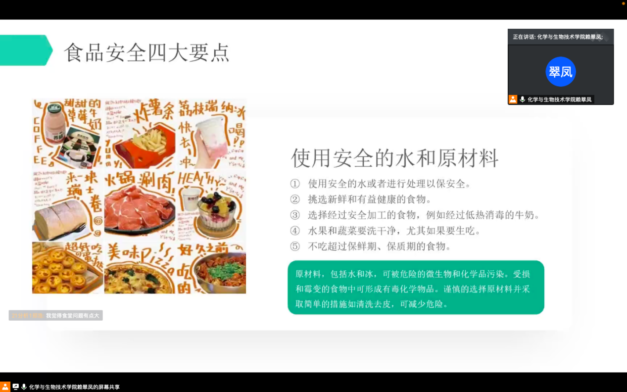 赖老师分别从病毒的特征、防疫知识、心理抗疫指导和食品安全四大要素展开。她要求同学每日晨午检,进行健康监测;疫情防控期间非必要不外出,全员佩戴口罩,正确防疫,加强校园疫情防控。在食品安全方面,选择健康有益的新鲜蔬果,增强自身抵抗力;选择经过安全加工的食物,降低食品风险。最后,赖老师提醒大家,在人流量较大地方,一定要佩带口罩,保护好自己。