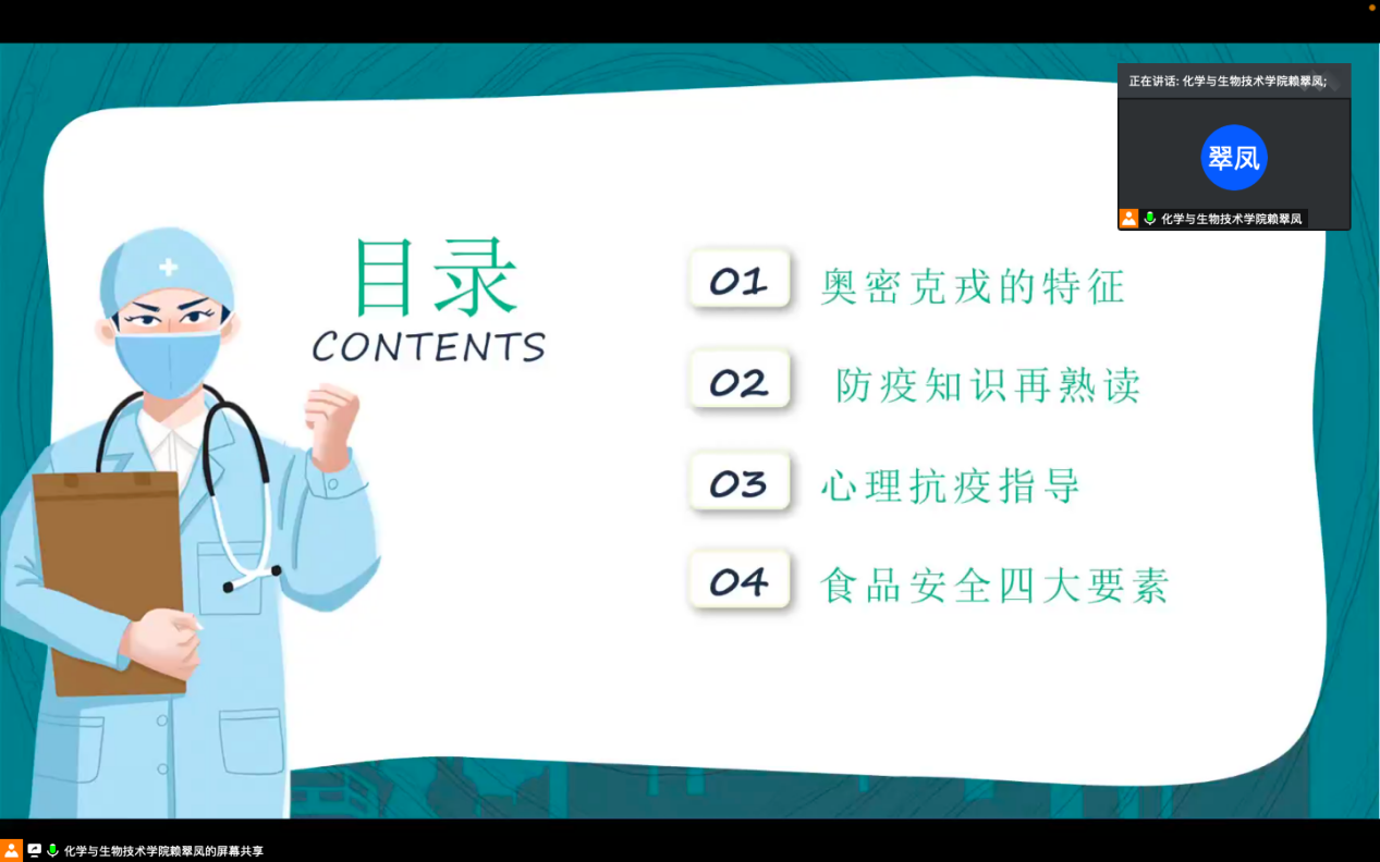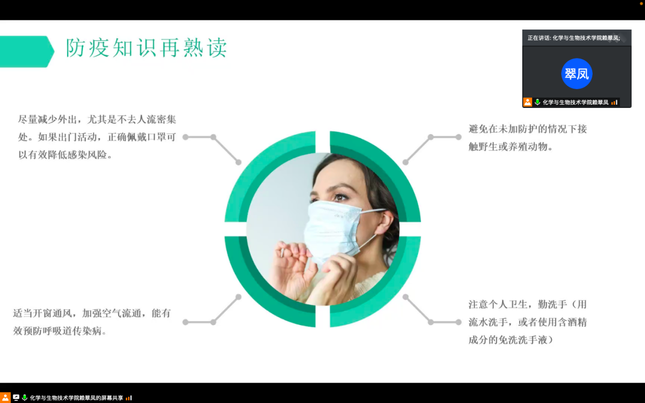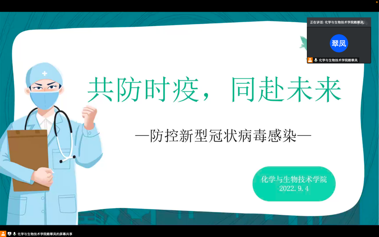 为了让同学们了解福建省疫情防控形势的严峻性,明白疫情防控刻不容缓,增强疫情防控意识,掌握防疫知识,化学与生物技术学院于2022年9月4日线上开展“共防时疫,同赴未来”主题班会。