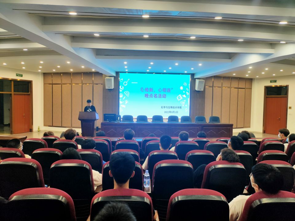 与夏天告别,与秋天相拥。伴随着新学期的到来,新同学载着希望,面向未来,绽放青春。为了做好迎新生工作,让2022级新生尽快了解校园文化,熟悉环境,融入集体,化学与生物技术学院2022年9月1日在多功能厅开展了“心传新,心相连”晚点名活动。