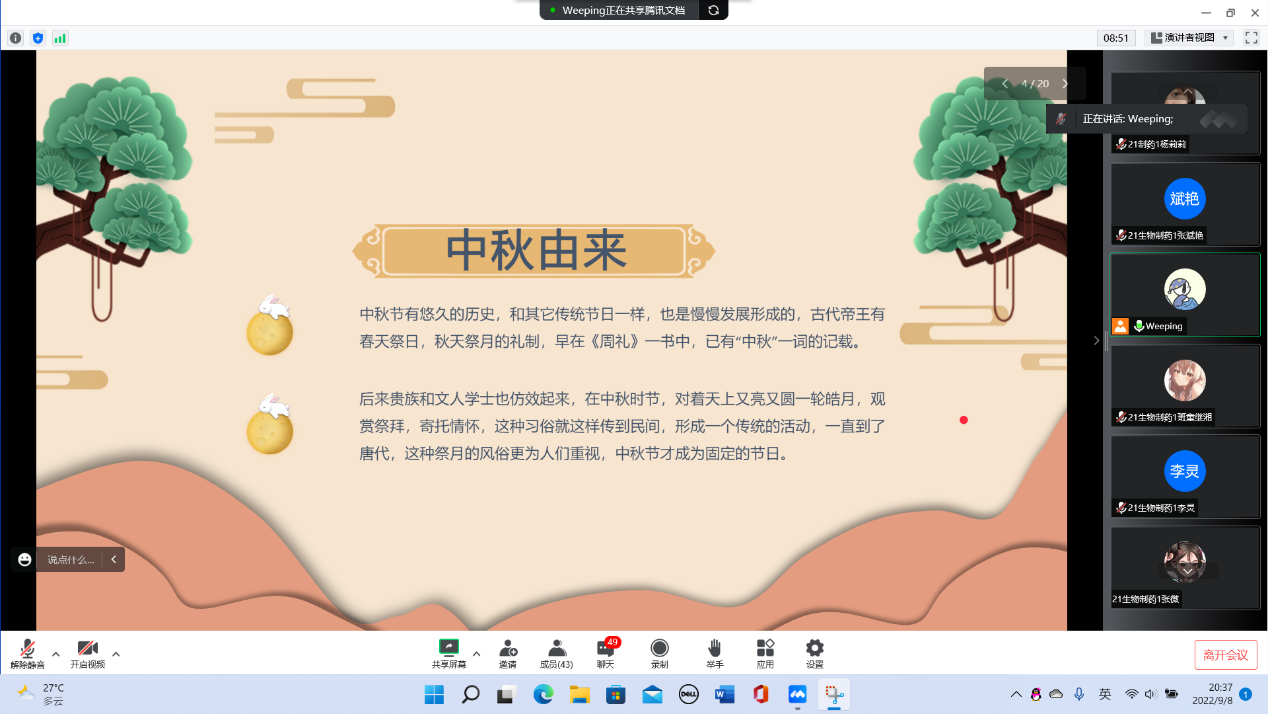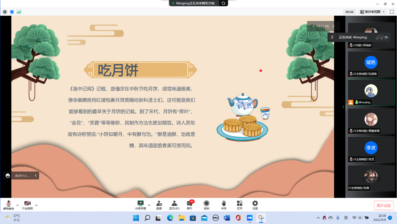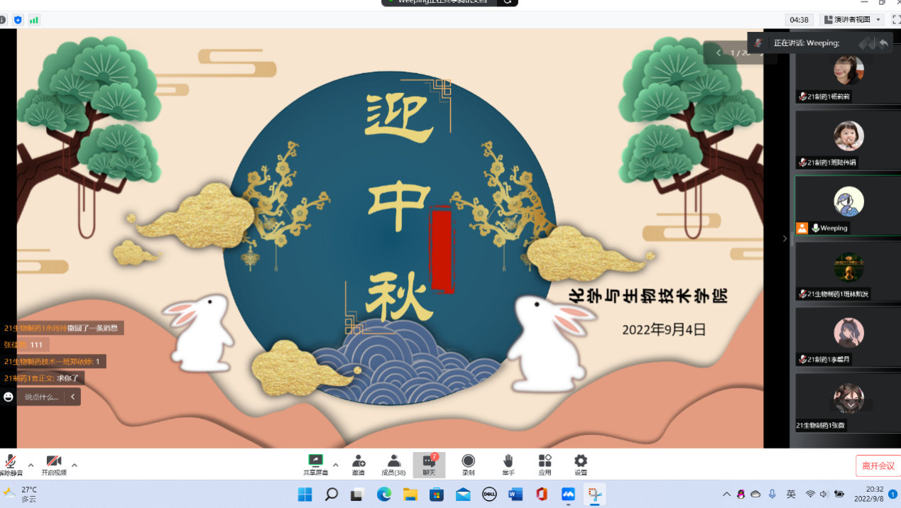 为了让学生感受浓厚的节日气氛,广泛挖掘与诠释中华传统节日的文化内涵,进一步弘扬和传承中华传统文化,培养爱国主义情怀,化学与生物技术学院2022年9月8日在线上开展“迎中秋”主题班会。
