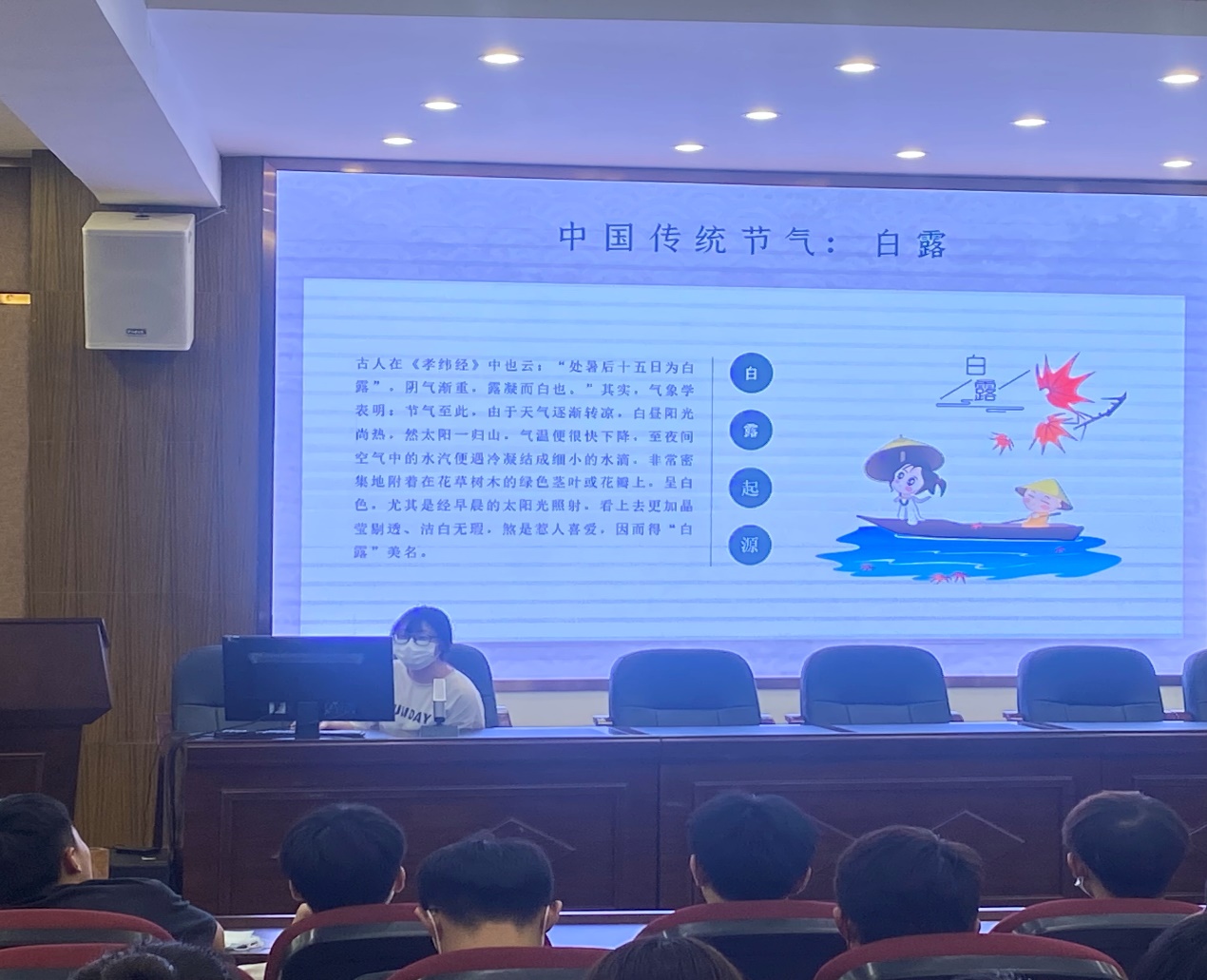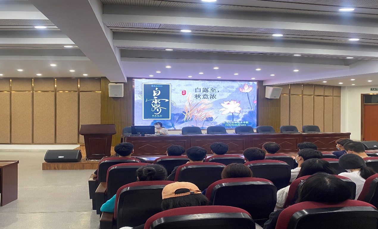 “白露秋分夜,一夜凉一夜”,在这个秋高气爽的日子里白露节气如约而至。为了让学生了解白露节气的有关知识,弘扬传统文化,化学与生物技术学院于2022年9月12日在多功能厅开展了“白露至,秋意浓”主题班会。