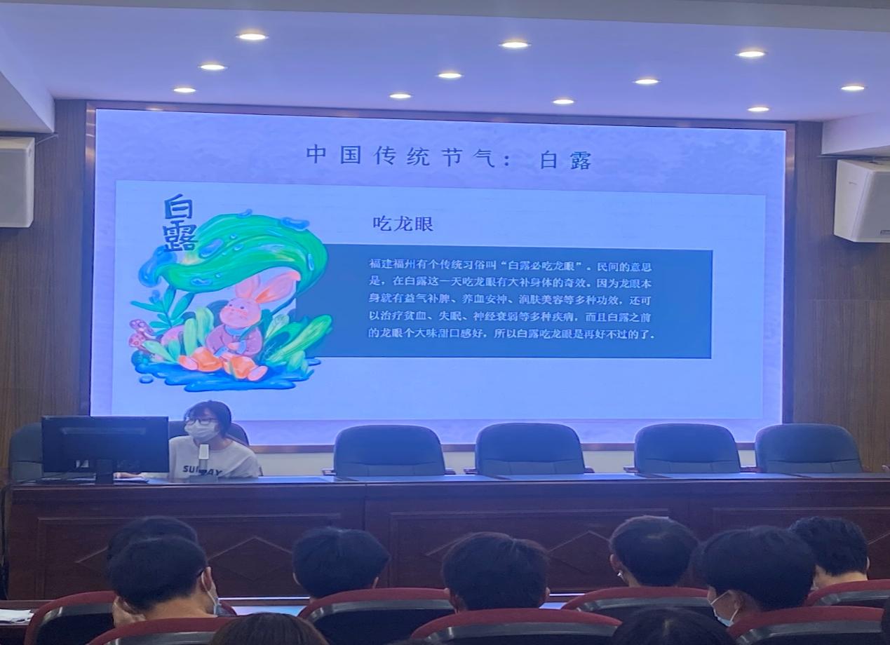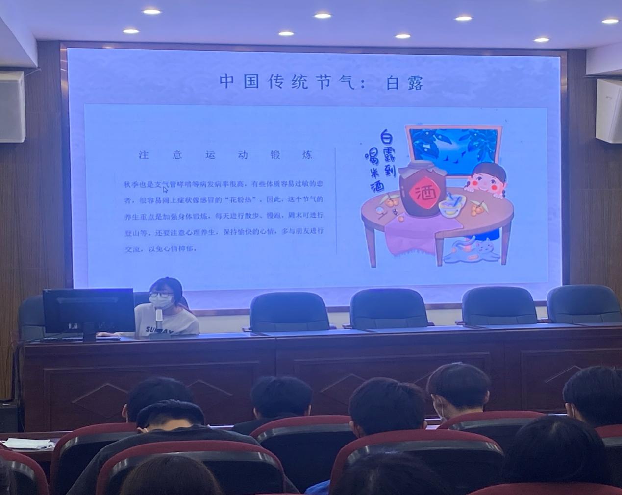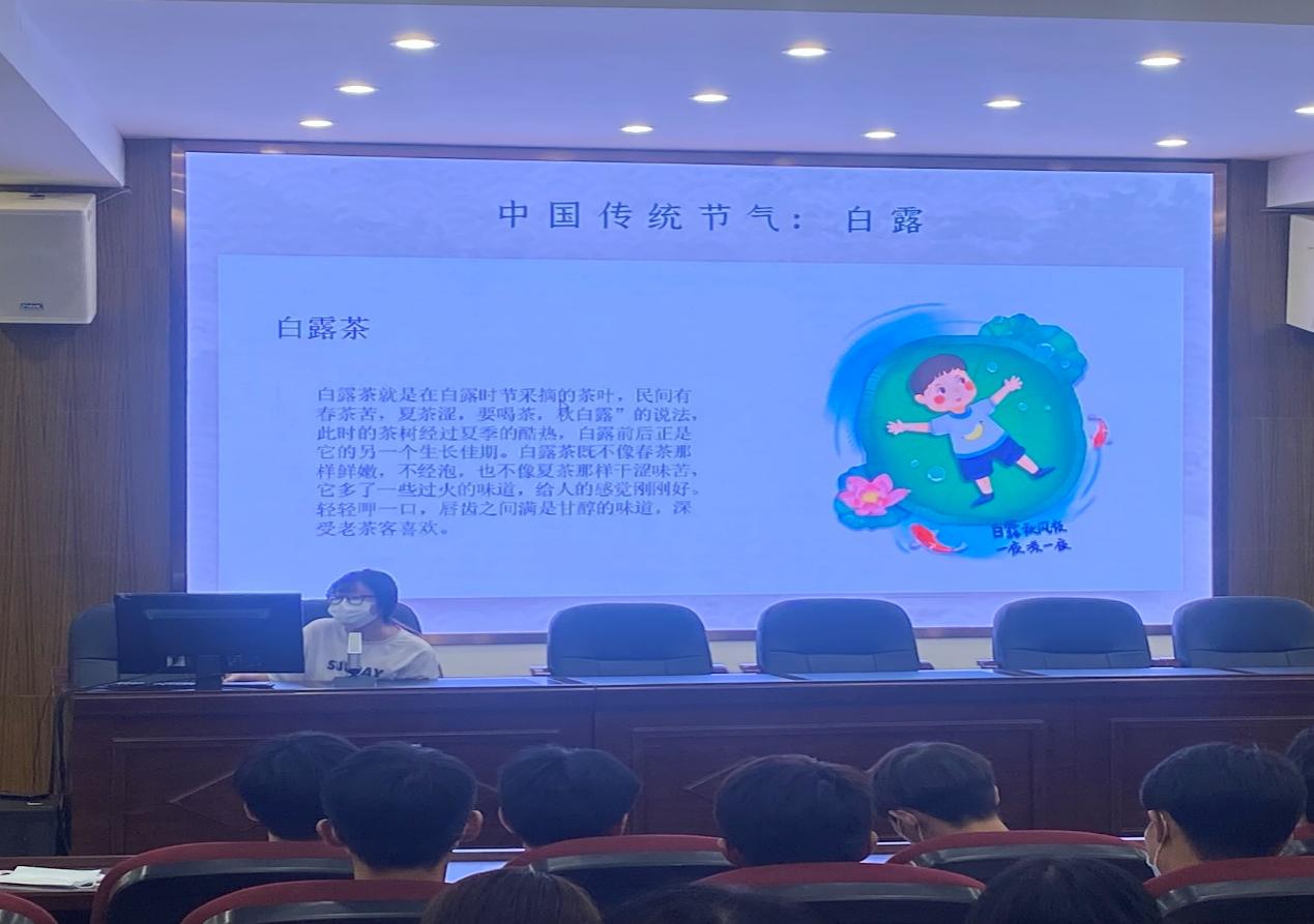 王同学首先向同学们详细地介绍了白露的由来:白露,是二十四节气中的第15个节气,秋季第3个节气,表示梦秋时节的结束和仲秋时节的开始,是反映自然界气温变化的重要节令。其次,她分享了白露的节气习俗,和其他节气一样,在白露时节,中国人也有一些独特的习俗。民间认为在白露这一天吃龙眼有大补身体的奇效。然后,她推荐了白露茶与番薯等特色白露节气美食,呼吁同学们要有健康养生的生活方式,其中重点提到需要早睡早起和加强体育锻炼。由于秋季干燥,“白露”的饮食养生是以“润”为主,需要“养阴液,润肺燥”,让身体“滋润度秋”。
