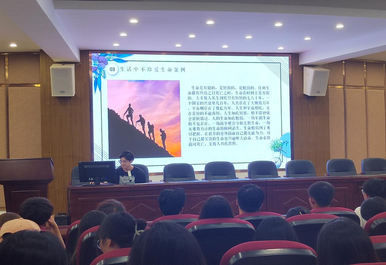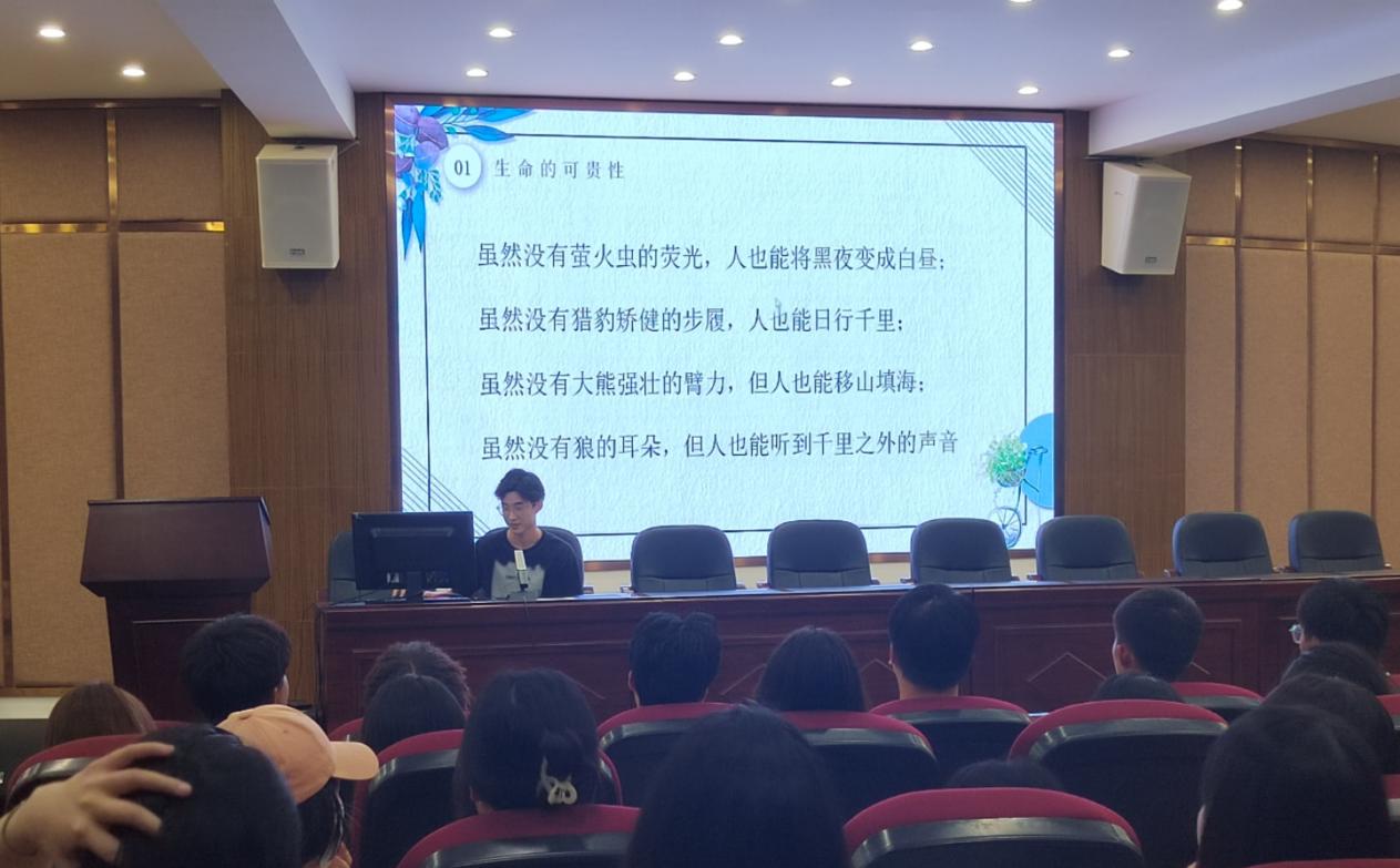阮同学首先提到了生命的可贵性。生命来之不易,对多数个体来说生命只有一次。生命是人们总有其他一切权利的源泉,珍爱生命是一种义务,爱自己是对生命本身的崇敬和珍重。生命在时间上是有限的,在意外面前生命是脆弱到难以把握的。接着,他通过生活中不珍惜生命的案例,告诫同学们要合理安排自己的时间,充实自己,积极参加体育锻炼,保持心理健康,面对苦难不要轻易放弃生命。