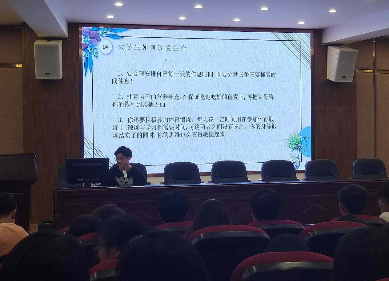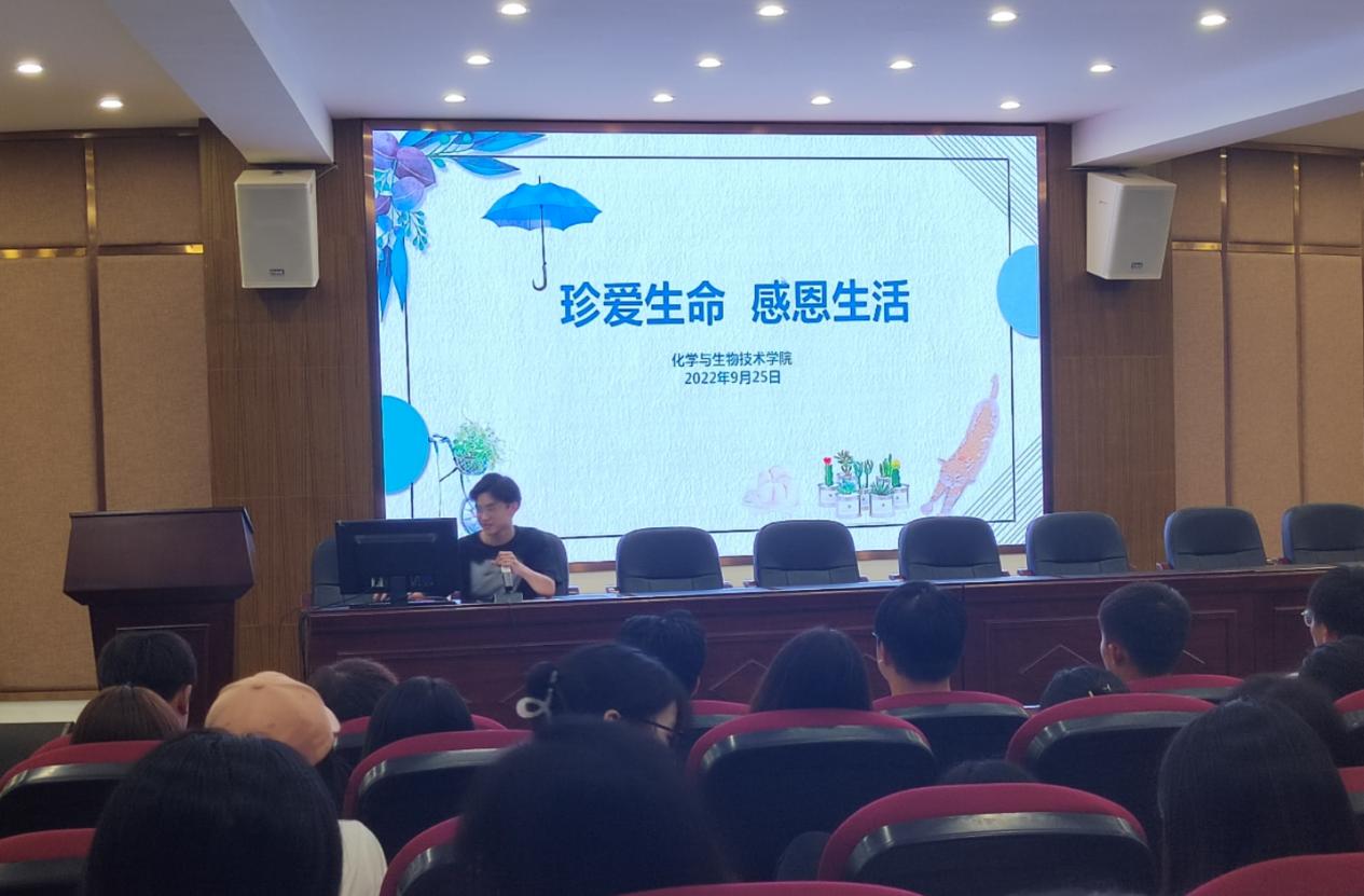 为了让同学们认识到生命的可贵,珍爱生命、健康成长,在生活中学会感恩,化学与生物技术学院于2022年9月25日在多功能厅开展“珍爱生命 感恩生活”主题班会。