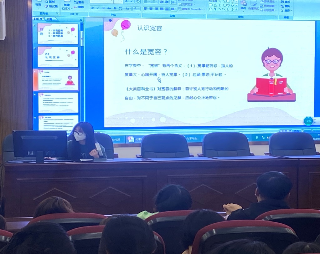 宽容是一种修养,是一种品质,更是一种美德。在班会是,郑同学首先从宽容的含义讲起,指出宽以待人是中国的传统美德,宽容具有强大的感化力。接着,她带领同学们从一个个小故事中去感悟宽容,比如《周总理轶事》、《六尺巷》、《宽大为怀的毕加索》,同学们也津津有味地聆听着关于宽容的小故事——《周总理轶事》、《六尺巷》、《宽大为怀的毕加索》。最后,她呼吁同学们在日常生活中要以宽容之心待人,善于与他人和睦相处、互相学习、共同进步,构建良好的人际交往关系。