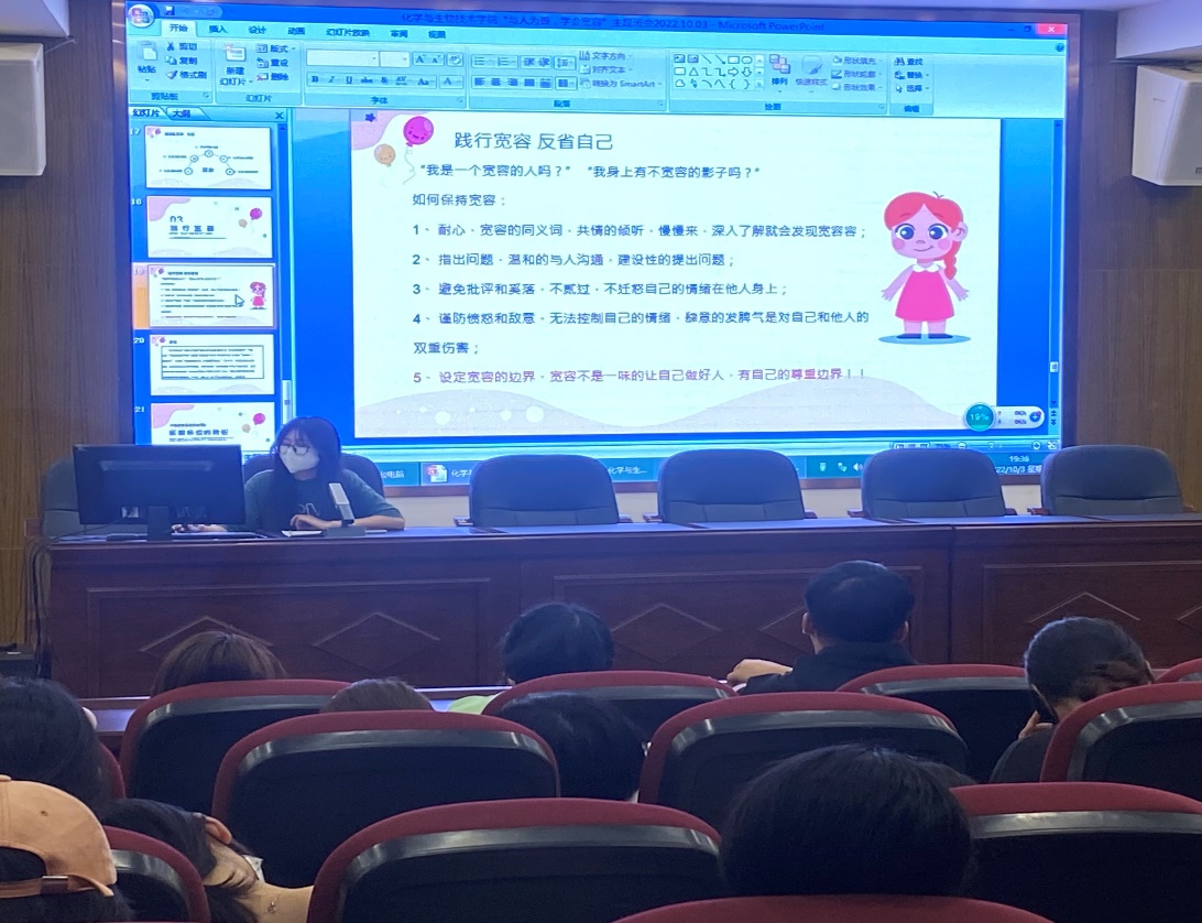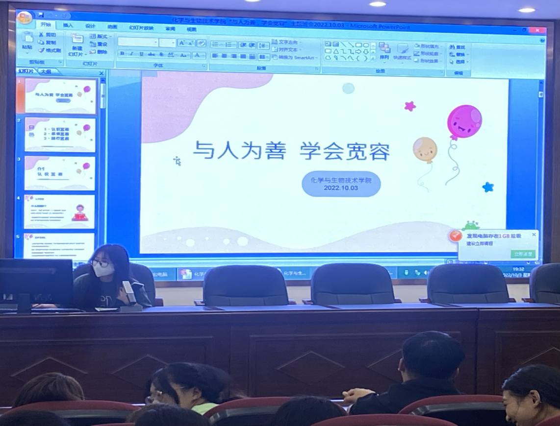 为了帮助同学们了解人际交往的重要性,掌握人际交往的技巧,宽以待人,化学与生物技术学院于2022年10月3日在多功能厅开展了“与人为善,学会宽容”主题班会。