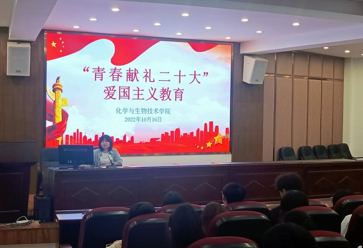 为迎接党的二十大胜利召开,激励同学们砥砺奋斗,化学与生物技术学院于2022年10月16日在多功能厅开展了“青春献礼二十大”爱国主义教育主题班会。