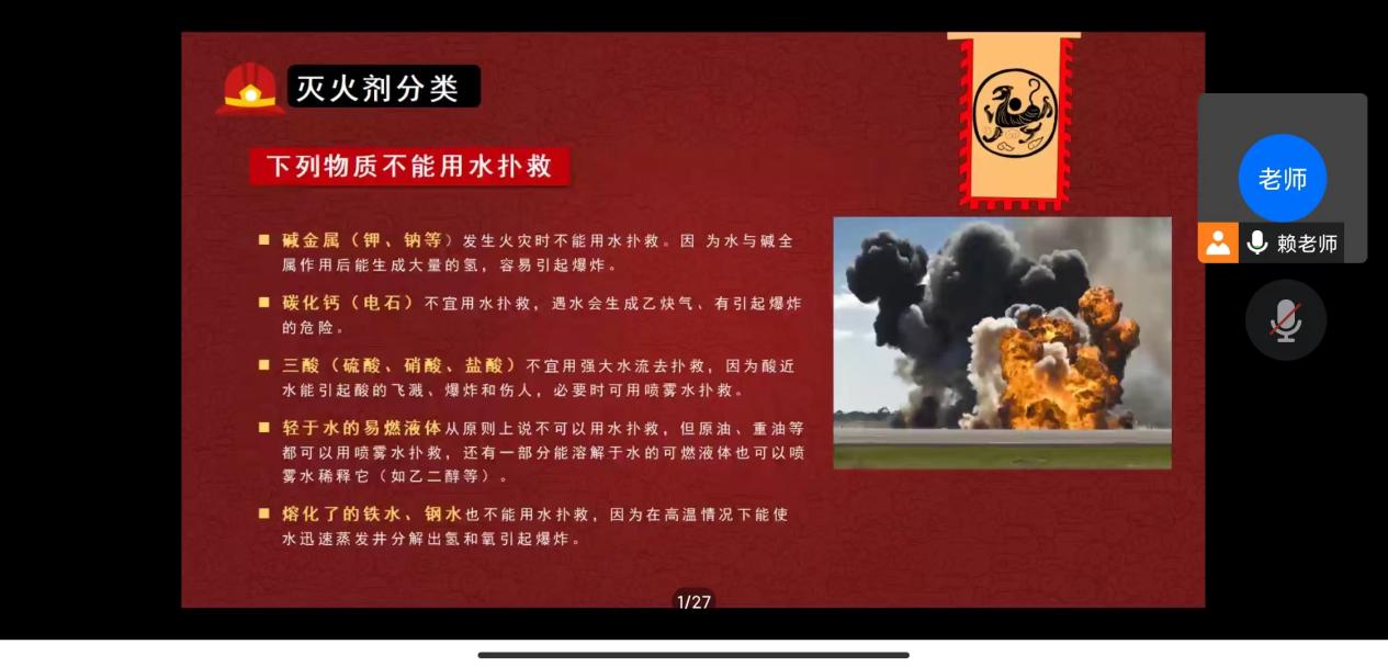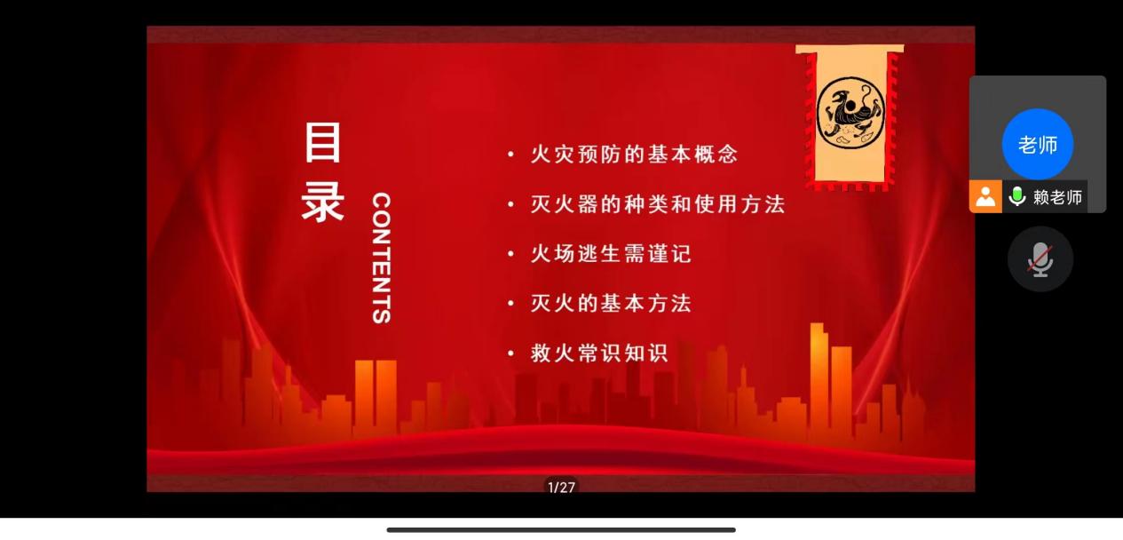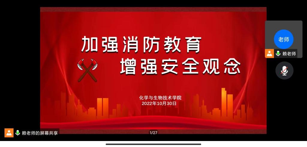 为普及消防安全知识,加强防范意识,增强消防安全观念,提高预防消防安全和自救自护能力,化学与生物技术学院于2022年10月30日在腾讯会议上开展了“加强消防教育,增强安全观念”主题班会。