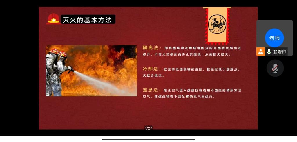 赖老师首先提到了火灾预防的基本概念。燃烧是由物质燃烧的温度、助燃物或氧化剂以及可燃物质三个条件组成。接着,她讲到了灭火的方法有隔离法、窒息法、冷却法。可以通过降低燃烧物的温度,阻止空气流入燃烧区域,燃烧物得不到足够的氧气而熄灭。她强调了水不是万能灭火剂,有少数物质容易与水发生反应,二氧化碳灭火器因为不导电的特点,适用于扑救价值较高的生产设备的火灾。第三,她阐述了灭火的小技巧。遇到室内着火不要急于打开门窗,火势不大时应奋力将小火控制、扑灭。她还分享了火场逃生需谨记的四个要点,让同学们了解了火灾发生时能采取的可行措施。