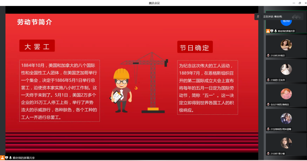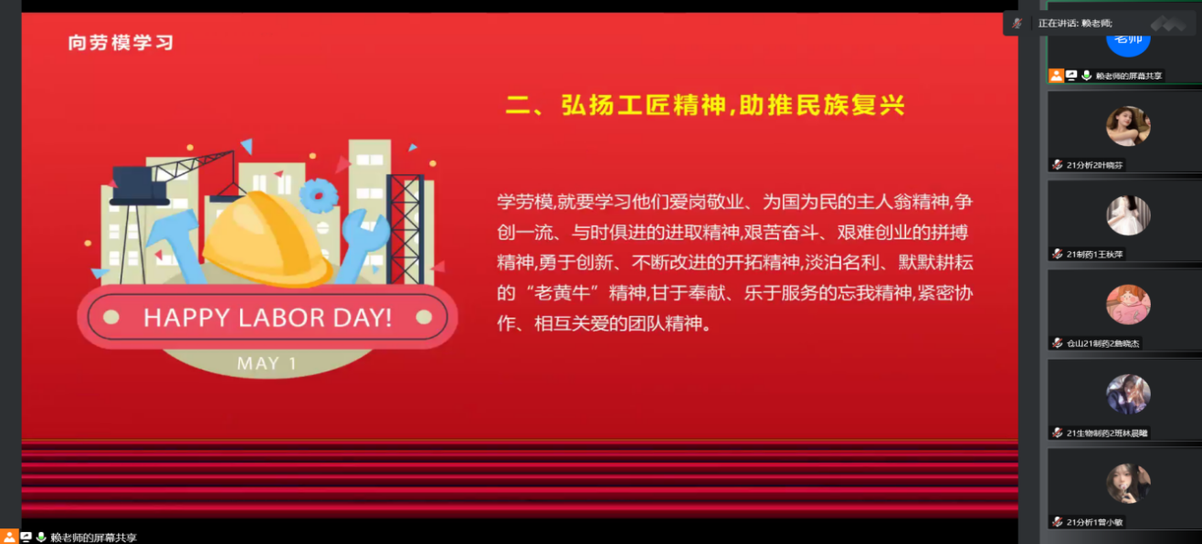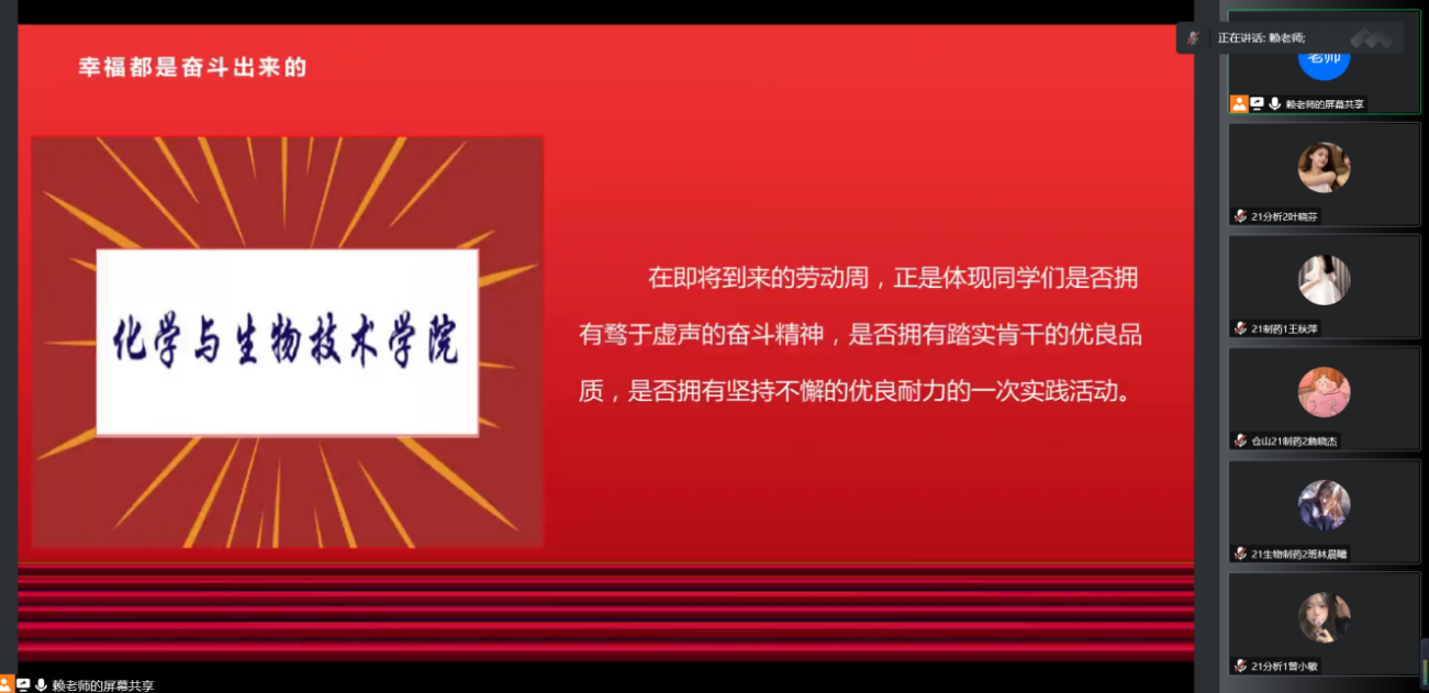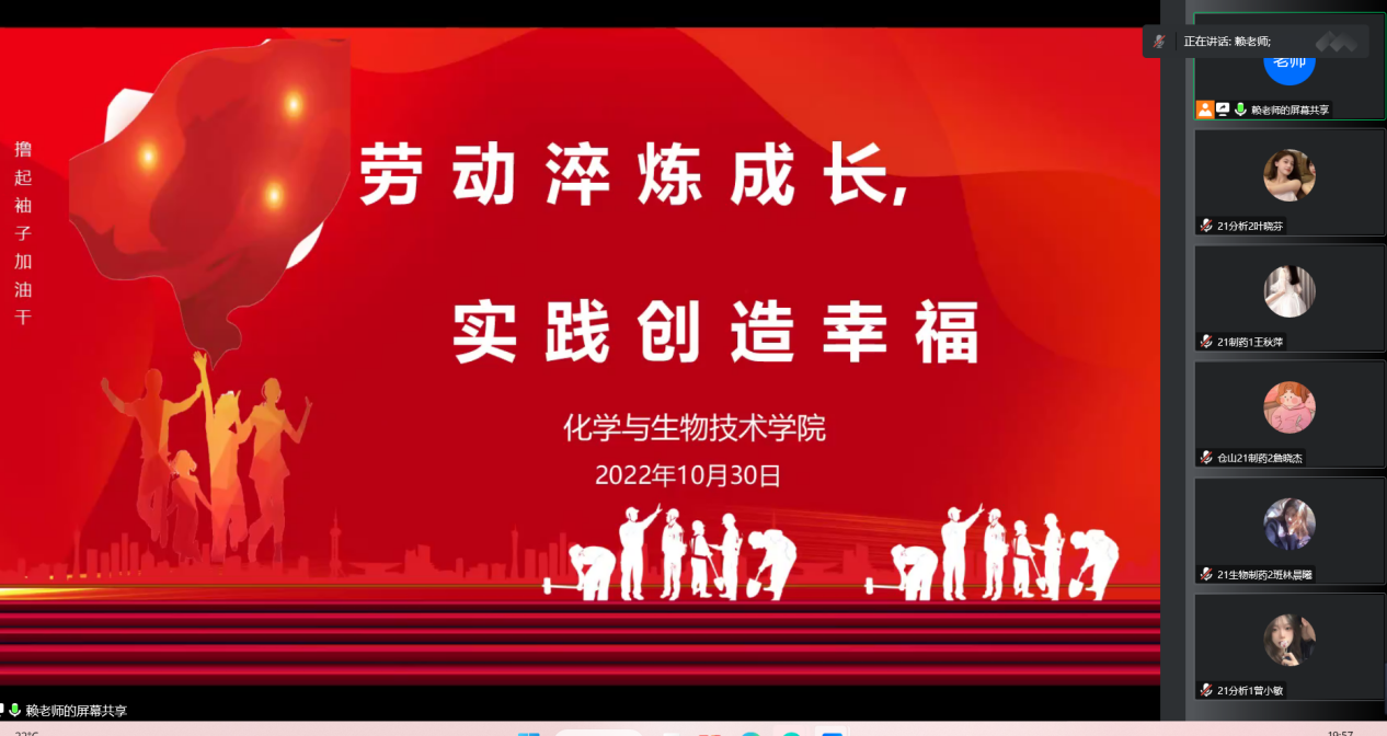 为强化学生的劳动教育,培养学生良好的劳动品质,不断提高学生的劳动素质,迎接学院劳动周的到来,化学与生物技术学院于2022年10月30日在线上开展了“劳动淬炼成长,实践创造幸福”主题班会。
