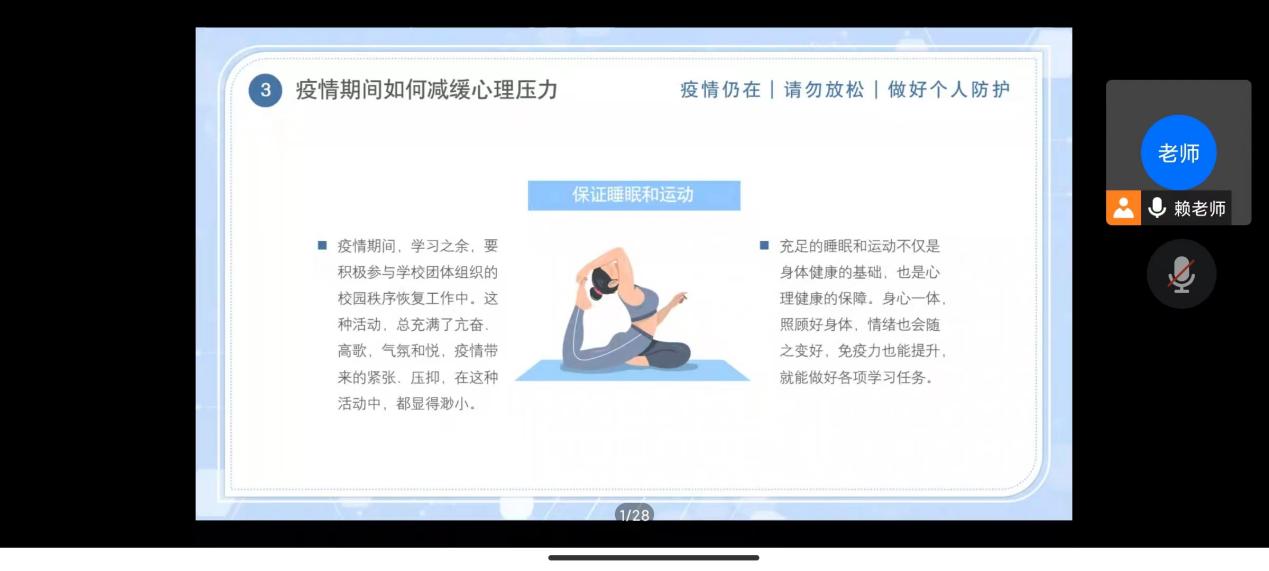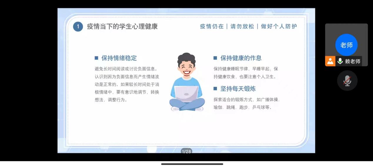 在班会上,赖老师首先提到了新型冠状病毒对身心的危害。抗击疫情,既要做好身体防护,也要做好心理防护。接着,她还提到了疫情当下学生的心理健康,比如保持情绪稳定、保持健康的作息,坚持每天锻炼、提高信息判断能力、保持课内外学习和维护人际支持。第三,她指出心理调适的方法,学校开展心理教育课程,关注差异,对不同年龄特征和学段特点提供心理指导,建立心理危机干预预案,完善心理危机预防,以缓解学生心理压力。最后,赖老师告诉同学们:目前疫情形势严峻复杂,风险就在身边,我们要严格遵守和配合学校疫情防控各项规定,并保护好自己,一起守护好校园环境。
