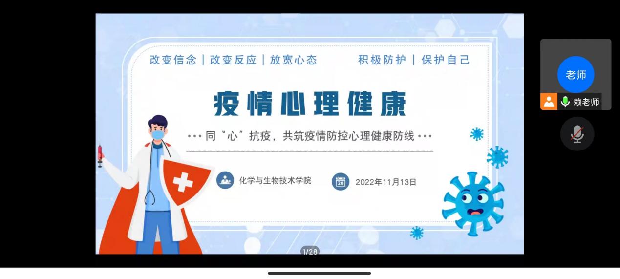 为了积极应对突如其来的新冠疫情带来的心理危机,引导大学生管理和调节自己的情绪,化学与生物技术学院于2022年11月13日在线上开展了“疫情心理健康”主题班会。