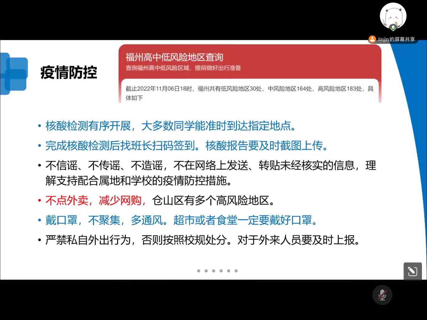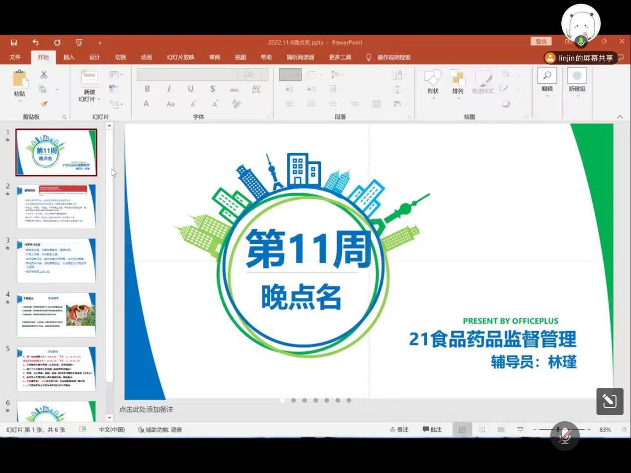 突如其来的疫情给同学们的学习生活带来了影响,但线上教学、劳动教育等日常活动仍有序开展。11月6日晚,辅导员林瑾主持第十一周线上晚点名,21级食品药品监督管理专业全体同学参加。