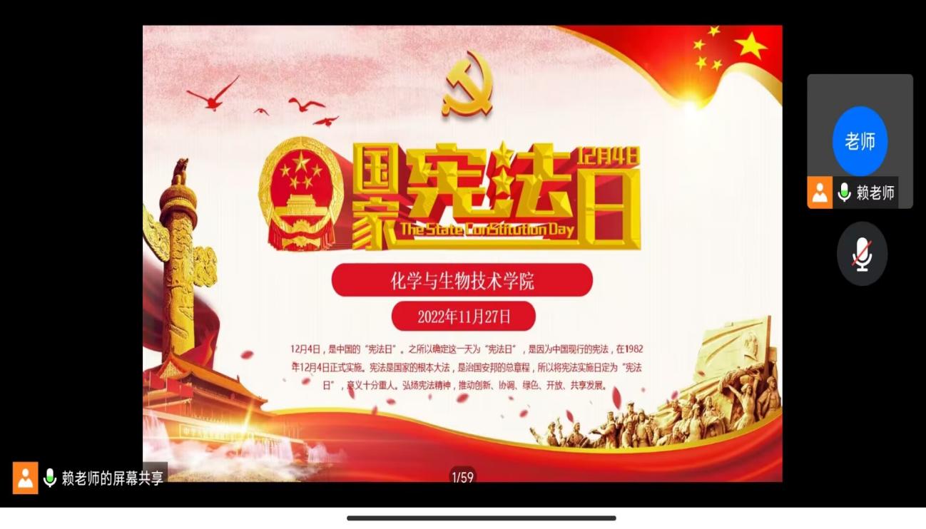 为促进学生对宪法的了解与认识,培养学生的国家意识、法治意识、社会责任意识,引导学生养成“学法,知法,守法,护法”的行动自觉,化学与生物技术学院于2022年11月27日在线上开展了“12.4国家宪法日”主题班会。