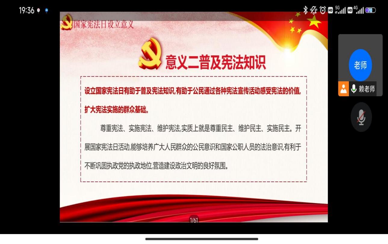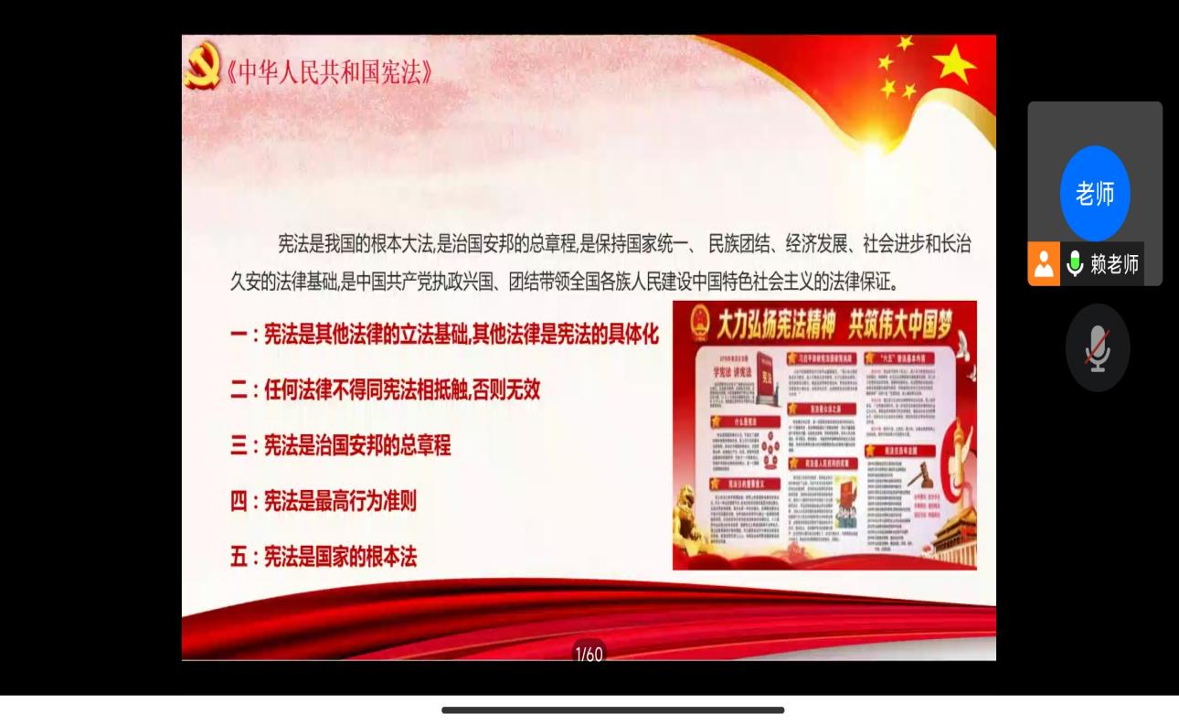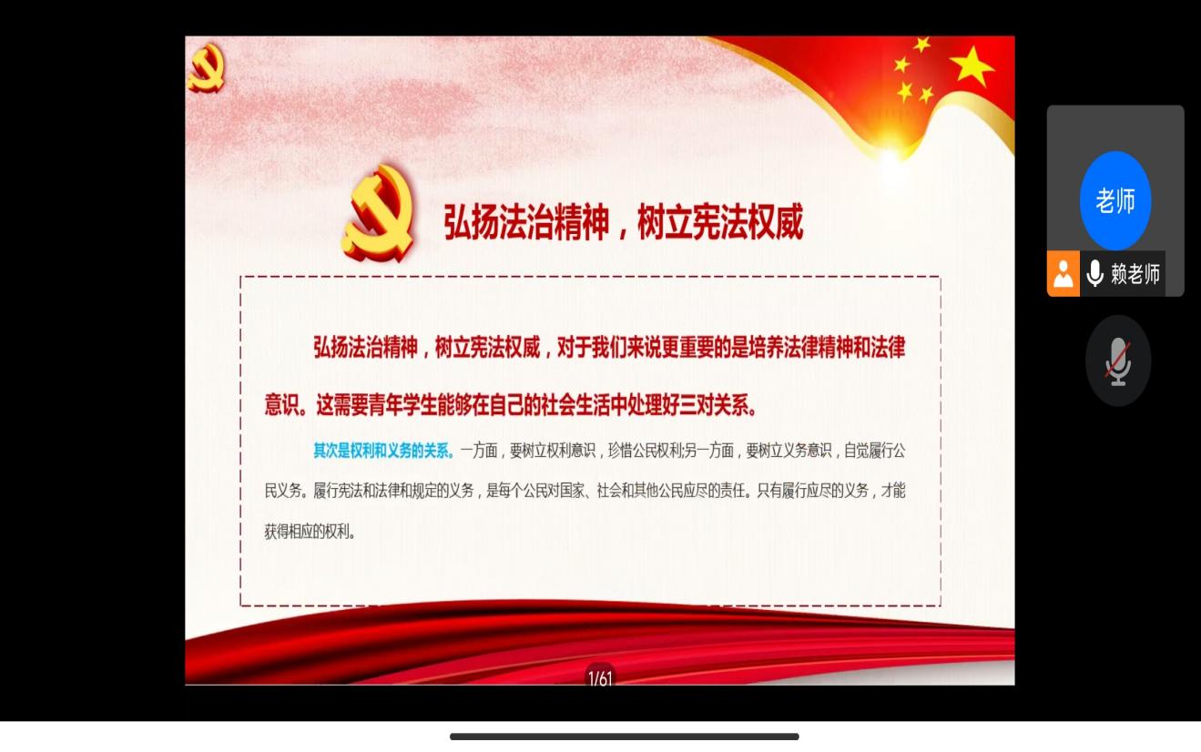主讲人赖老师先向同学们讲述了12·4宪法日的由来和设立的必要性和重要性;接着她详细说明了《中华人民共和国宪法》相关知识。她指出宪法是中华人民共和国的根本大法,具有最高法律效力。第三,她普及了国家爱宪法日、全国法制宣传日,希望同学在学习和生活中学法、知法、守法、用法。最后,赖老师阐述了国家宪法日的设立意义,并倡导全体同学弘扬法治精神,树立宪法权威。