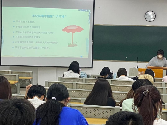 徐同学通过两个溺水案例警示同学们远离危险水域、不私自游泳、不到无安全设施、无救援人员的水域游泳,引导同学们牢记安全。同时,她还就如何预防溺水、溺水救治方法等相关的安全知识进行普及。辅导员林瑾老师提到:每一位同学都应该珍爱生命,远离危险,让家人放心安心。同学们也纷纷表示将把安全知识牢记于心,珍爱生命。