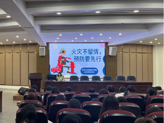 为加强校园安全工作,普及消防安全知识,增强同学们的消防安全意识和自防自救能力,化学与生物技术学院于2023年6月4日在多功能厅开展了“火灾不留情,预防要先行”主题班会。