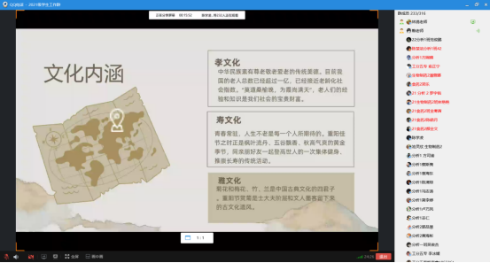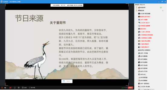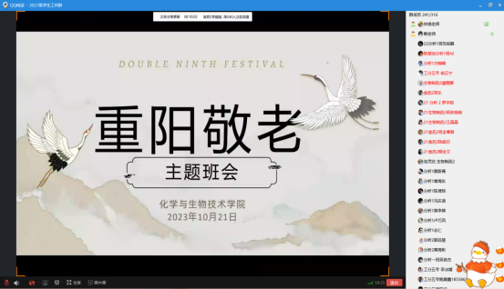 为了弘扬中华民族的传统美德,形成良好的尊老、敬老、爱老、助老的社会风尚,化学与生物技术学院于2023年10月22日线上开展了“重阳敬老”主题班会,2021级全体学生参加。