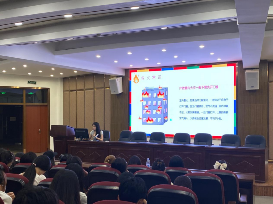 首先,孙老师讲述了燃烧的基本条件、灭火的基本方法、灭火剂的分类等救火常识,帮助新生进一步提高安全防范意识,掌握安全防范知识,加强自我安全保护能力。接着,她讲解了七种“救人术”,进一步了解人员救治的紧急方法,并且在面对突发状况时能够临危不惧。最后,孙老师介绍了火灾逃生的五个基本要素,了解如何在发生火灾时保护自己,掌握火险自救的基本常识,遇到火灾险情要沉着冷静,按照正确的逃生方式,尽快避险逃生或者等待救援。