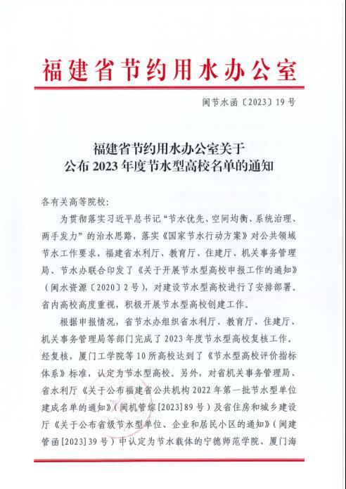 近日,福建省节约用水办公室公布了2023年度节水型高校名单,闽江师范高等专科学校经福建省节水办组织省水利厅、教育厅、住建厅、机关事务管理局等部门联合复核评审,达到了《节水型高校评价指标体系》标准,认定为节水型高校。