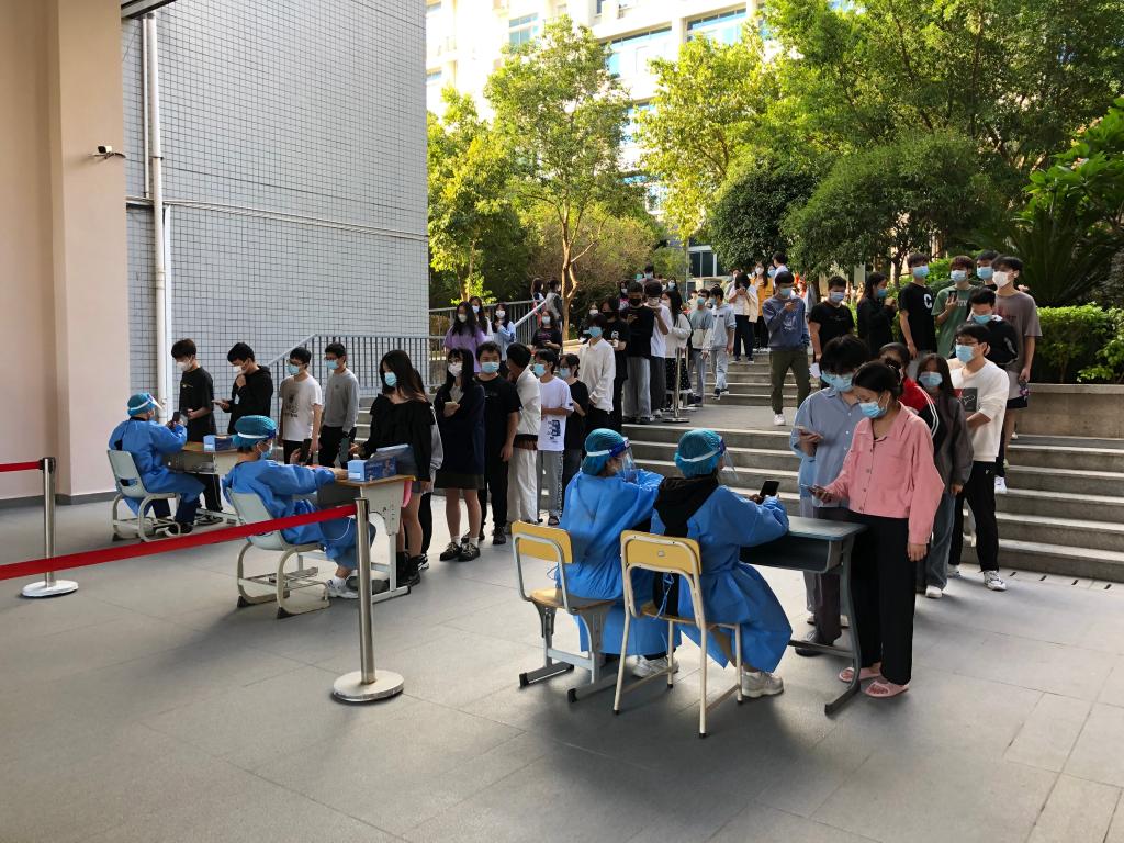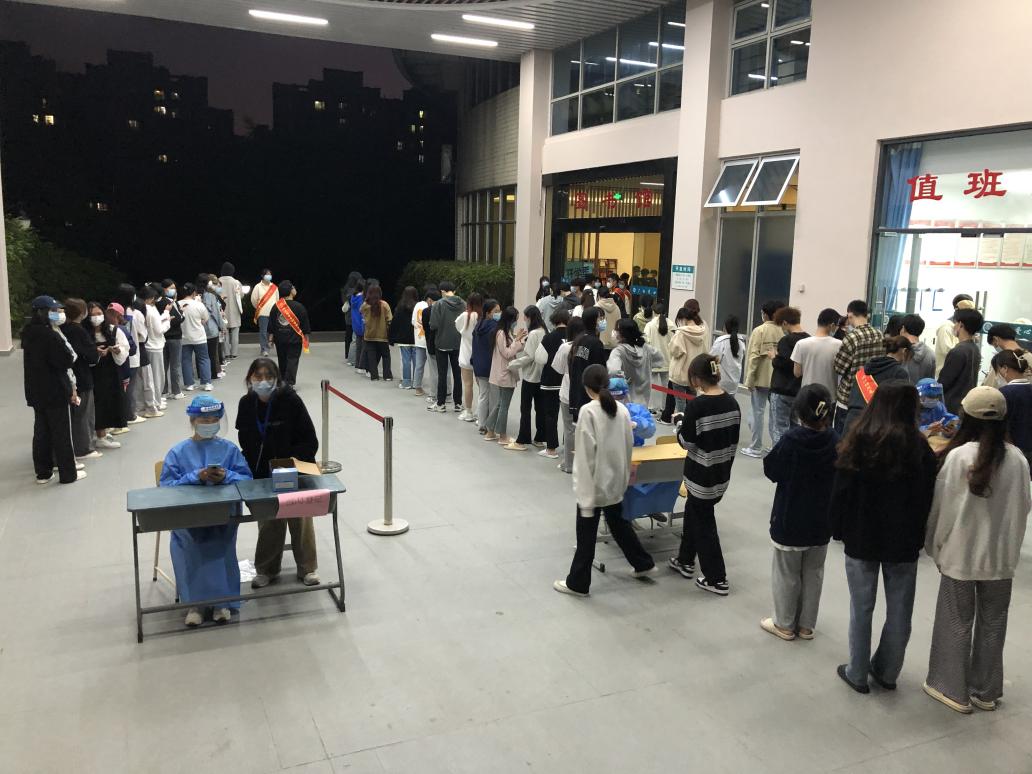 近期我市新冠疫情防控形势复杂严峻,为打赢疫情防控阻击战,切实保障我校师生身体健康,在校防控办统一部署下,10月23日,后勤保卫处快速响应,精心组织医护人员,在旗山和仓山校区同步开展核酸检测工作。当天下午三点医护人员、志愿者等陆续到岗到位,共同集结成一支“硬核”队伍,勠力同心,携手抗疫,为全员核酸检测有序开展提供了有力保障。在采样区设置了1米间隔线,师生员工在志愿者的指引下有序排队扫码登记取样,现场秩序井然。为了完成当天“应检尽检,不漏一人”的目标,减少上卫生间的麻烦,医护人员没喝上一滴水,没吃过一口饭,连续奋战8个小时,直至深夜十一点,共采集6647份咽拭子,医护人员才脱下那一身裹着严严实实的防护服,个个身疲力竭,脸上却露出满满的信心和坚毅。
