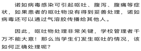 当学校发生诺如病毒感染病例呕吐时,应由接受过培训的教职员工进行规范处置,不得由儿童(学生)执行,严防因处置不当造成病毒扩散或疫情蔓延。