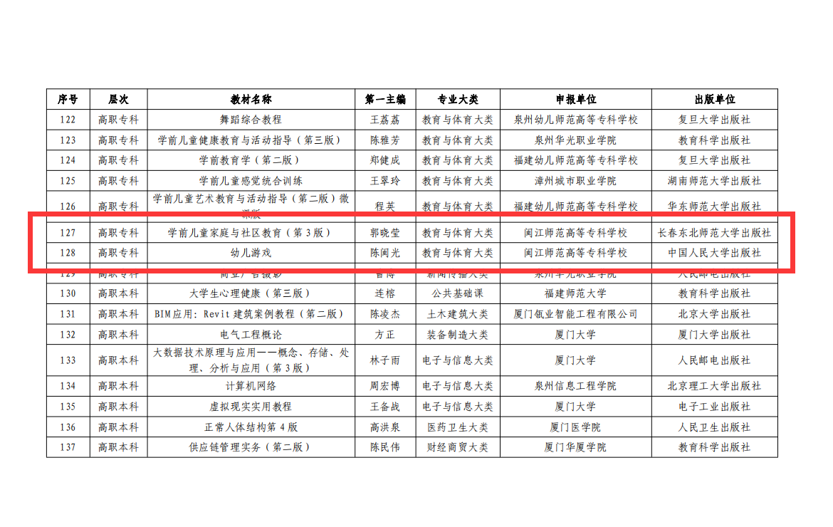 其中,郭晓莹教授主编的《学前儿童家庭与社区教育(第3版)》与陈闽光副教授主编的《幼儿游戏》两部教材,凭借其内容的前沿性、实用性和创新性,入选“十四五”首批职业教育国家规划教材,这不仅是对两位教师学术水平和教学研究成果的高度肯定,也是对我校学前教育专业领域教材建设的认可。