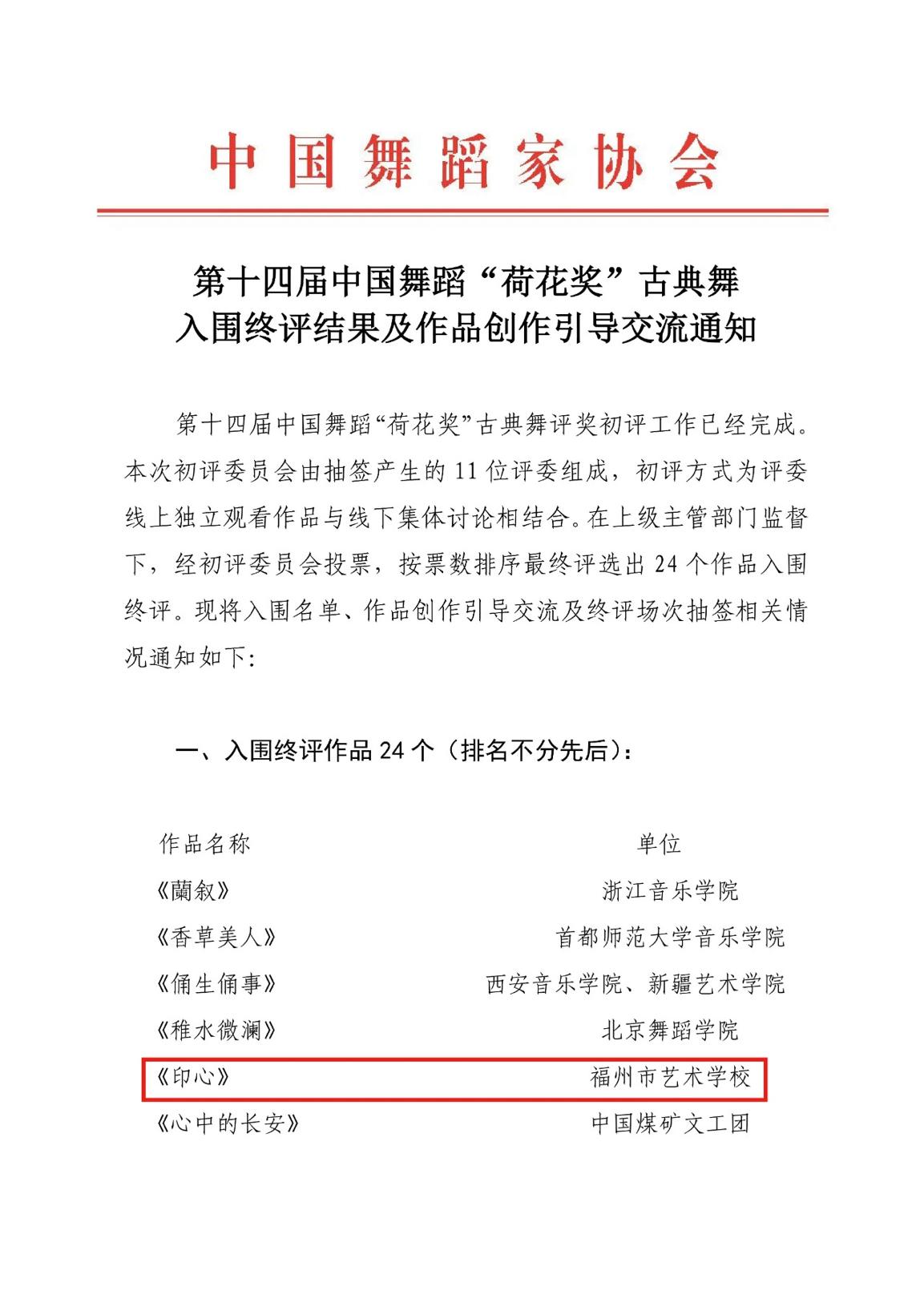 日前,由中国文学艺术界联合会、中国舞蹈家协会共同主办的第十四届中国舞蹈“荷花奖”古典舞初评结果揭晓,全国共有24部作品入围古典舞终评,由福建省舞蹈家协会选送、我校艺术学院(福州市艺术学校)排演的舞蹈《印心》榜上有名。