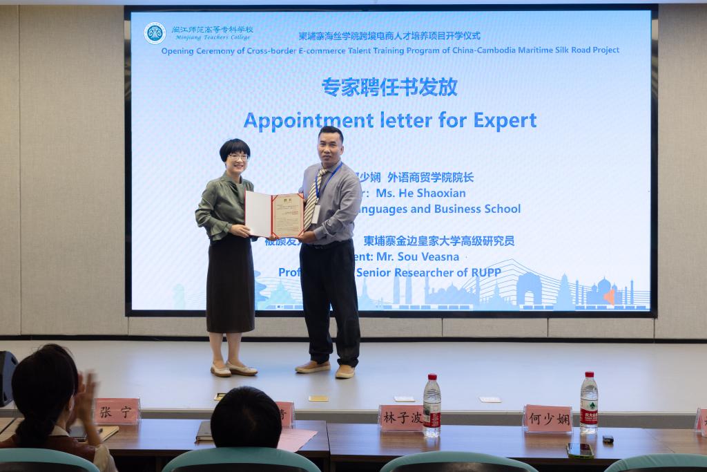 外语商贸学院院长何少娴为苏伟纳教授颁发中柬跨境电商国际合作虚拟教研室专家委任书。