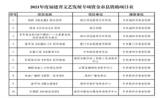 根据《福建省文艺发展专项资金管理办法》(闽财教〔2019〕14号),2021年度福建省文艺发展专项资金市县资助项目于2020年12月21日由中共福建省委宣传部进行公示。日前,公示期满,我校申报项目“百年党史的100个瞬间——大型篆刻系列作品创作与展示”成功入选资助项目名单。