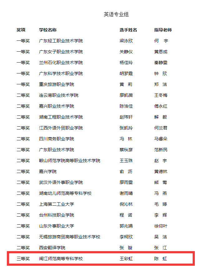 12月5日,2020“外研社·国才杯”全国英语写作大赛(高职组)总决赛远程线上举行,来自全国27个省(自治区、直辖市)的181名选手参加决赛争锋。由陈虹老师指导的19级英语教育专业王彩虹同学在比赛中表现突出,荣获该赛事专业组三等奖。