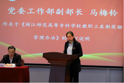 党工部副部长马梅铃作关于《闽江师范高等专科学校教职工表彰管理办法修订》的说明