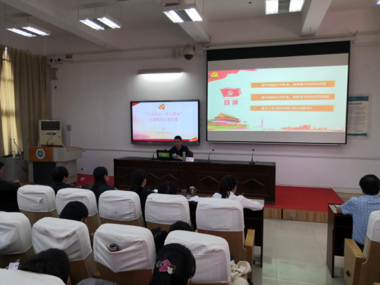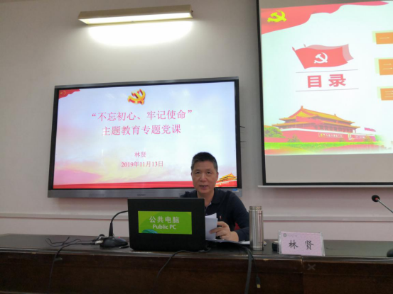 11月13日下午,按照学校“不忘初心、牢记使命”主题教育工作安排,林贤校长为初等教育系、学前教育系、艺术系、外语系、公共基础部和马克思主义学院全体党员干部讲授主题为“教育工作者如何践行初心和使命”的党课。