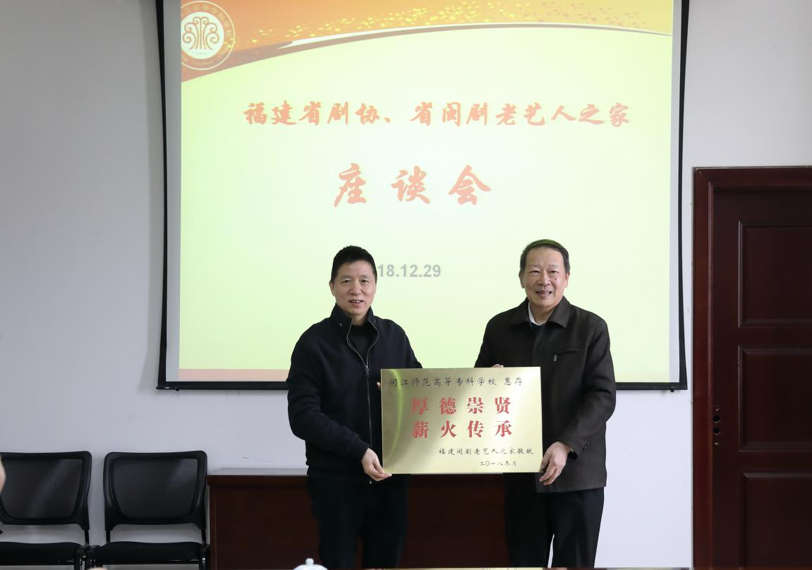 2018年12月29日,省剧协《剧谈》编辑部主任杜牧君与省闽剧老艺人之家会长吴峰生、副会长林芸生等一行到我校,送来贺信和“厚德传贤、薪火传承”牌匾。校党委书记陈荣生、校长林贤及艺术系主任杨晓勤等参加了会面。