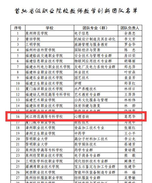近日,福建省教育厅公布了首批省级职业院校教师教学创新团队名单,我校申报的心理咨询专业教师团队获批立项,实现了我校省级教师教学创新团队零的突破。