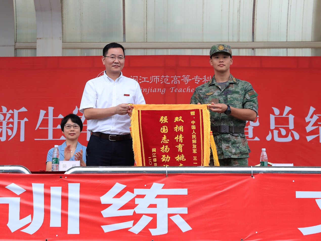 军训期间,我校与共建部队建立了深厚的友谊,为了表达我校对承训部队的崇高敬意,谢敏峰代表学校向承训部队赠送锦旗——“双拥情育桃李英才,强国志扬劲旅雄风”,并向优秀教官代表颁发荣誉证书,表达军地共建,鱼水情深的双拥情。