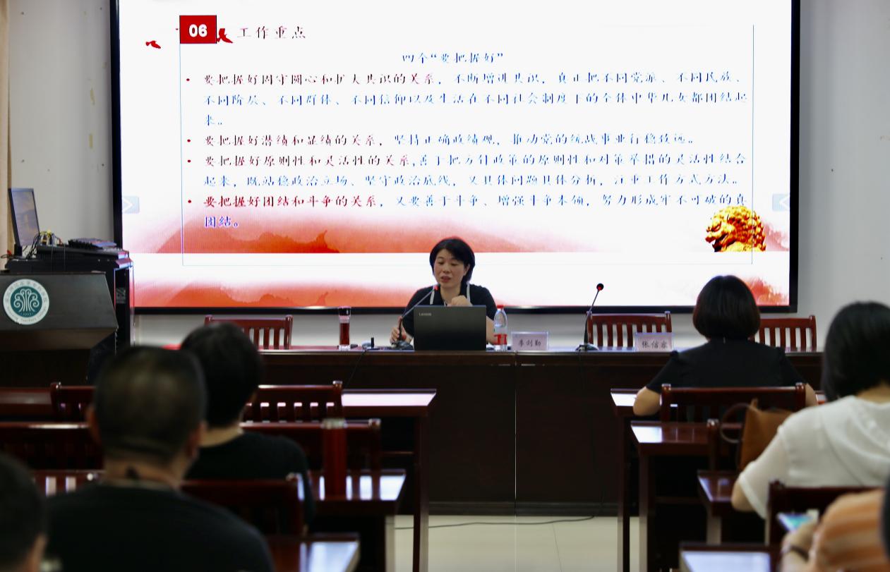李剑勤以“学习贯彻中央统战工作会议精神,落实《中国共产党统一战线工作条例》”为主题,从召开中央统战工作会议的重大意义、正确把握习近平总书记重要讲话中的重大理论创新、如何做好统战工作三个方面系统阐述习近平总书记在中央统战工作会议上的重要讲话精神,并就习近平总书记提出的“十二个必须”、三个“更加重要”进行了系统讲解。报告以百年统战历史为线,以中央统战工作会议为点,以统战工作重大理论创新为要,以做好统战工作为面,既有政治高度,又有理论深度,对于进一步做好我校的统战工作具有重要的指导意义,是一堂精彩而生动地“统战课”。