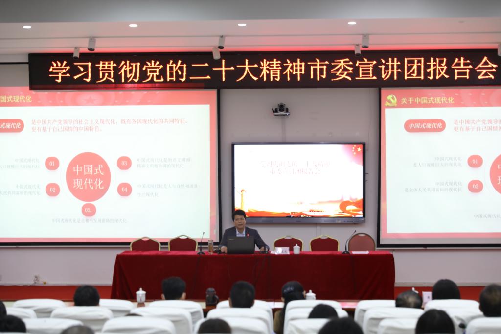 根据市委统一部署,11月23日,学习贯彻党的二十大精神市委宣讲团在我校开展宣讲活动。市委宣讲团成员、我校党委副书记、校长杨建义教授作宣讲报告并召开交流座谈会。校领导、中层干部、校宣讲团成员代表等参加会议,会议由党委副书记林旻主持。