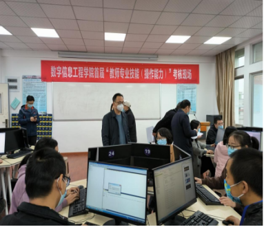 首届教师专业技能(操作能力)考核开考了16个项目。智能制造学院考核绘制零件图、斜面搬运手动示教编程、发动机正时齿形带的拆装、电路图完成电路接线等4项目,化学与生物工程学院考核EDTA标准滴定溶液的标定、药用葡萄糖中氯化物的检查方法、检测牛乳中酸度3个项目,数字信息学院考核专业群通用技能、专业核心技能两大类项目,涵盖组网技能前端开发技能、数据库应用技能以及软件技术、物联网应用技术、大数据技术、数字媒体技术、现代教育技术、信息安全技术应用专业核心技能共9个模块项目。一共50名专业教师参加了考核并均取得了优良成绩。
