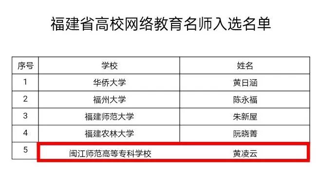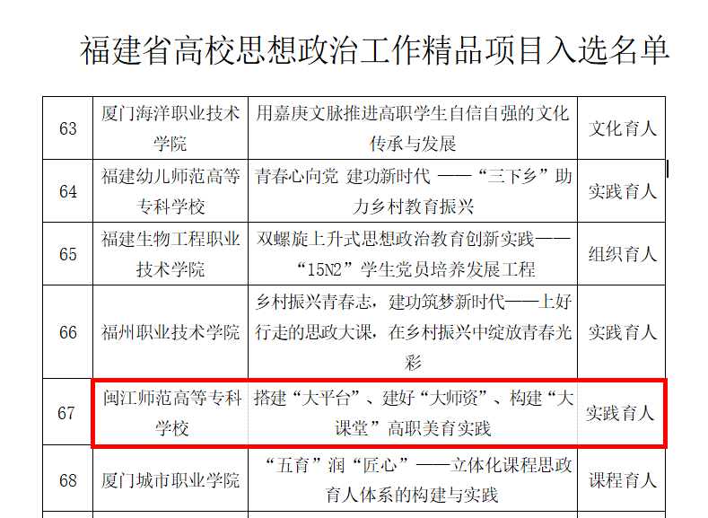 近日,中共福建省委教育工委公布了2022年福建省高校思想政治工作精品项目、高校原创文化精品项目、高校网络教育名师入选名单,我校实践育人项目《搭建“大平台”、建好“大师资”、构建“大课堂”高职美育实践》入选福建省高校思想政治工作精品项目,闽剧现代戏《青春祭》入选福建省高校原创文化精品项目,外语与商贸学院黄凌云入选福建省高校网络教育名师。