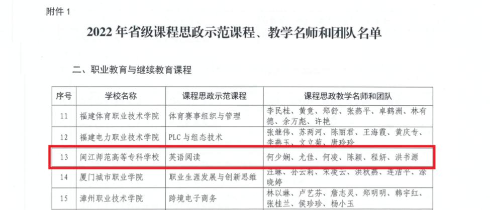 近日,福建省教育厅发布《福建省教育厅关于公布2022年省级课程思政示范项目的通知》(闽教高【2022】37号),我校获批2项省级课程思政示范项目。其中,闽江师范高等专科学校课程思政教学研究中心获批为省级课程思政教学研究示范中心,《英语阅读》课程获批为省级课程思政示范课程,何少娴教授及其带领的教学团队获批省级课程思政教学名师和团队。