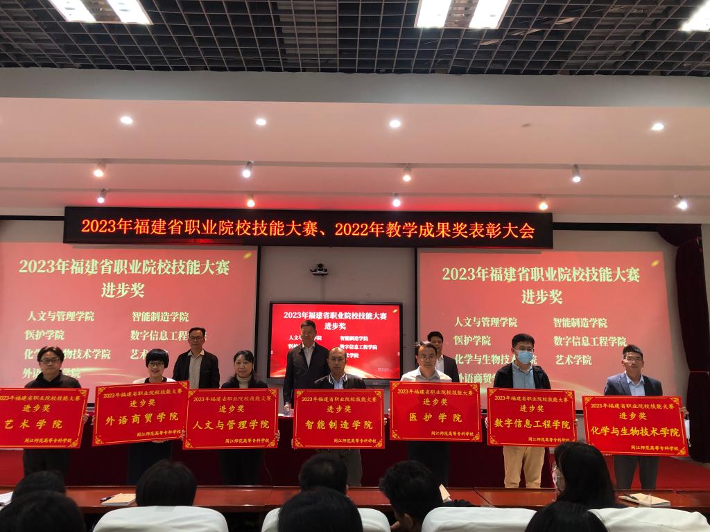 会上,校领导分别为获得2023年福建省职业院校技能大赛成绩进步学院和2022年福建省教学成果奖获奖项目的成果完成者颁奖。数字信息工程学院、外语商贸学院从赛事报名与备赛情况等方面与大家分享了获奖经验。