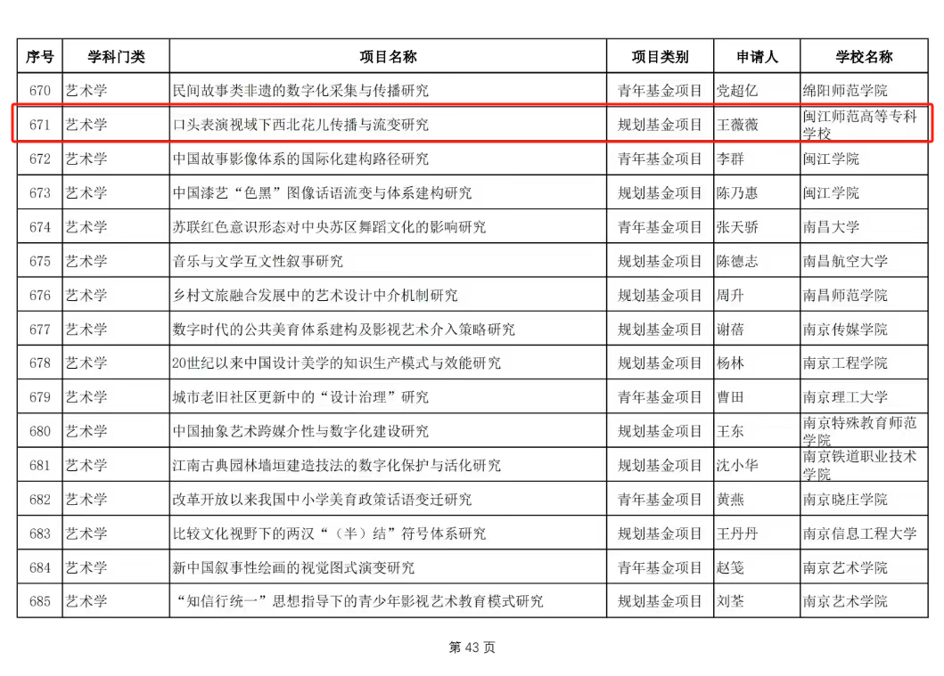 近日,教育部2023年度人文社会科学研究一般项目评审结果进行公示,其中,我校艺术学院王薇薇副教授申报的艺术学项目入选公示榜单。这是我校首次获批立项教育部人文社会科学规划基金艺术学项目。