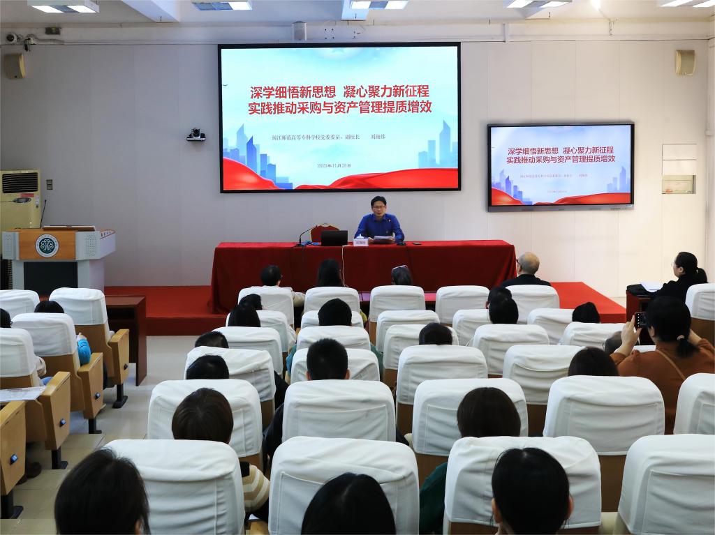 校党委委员、副校长刘翔炜以《深学细悟新思想凝心聚力新征程 实践推动采购与资产管理工作提质增效》为主题,详细阐述了我校在采购与资产管理工作方面的现状与差距,针对采购项目预算测算、采购需求论证、履约验收、预算执行率等四个方面存在的具体问题,结合学校高质量发展提出进一步的优化方案。